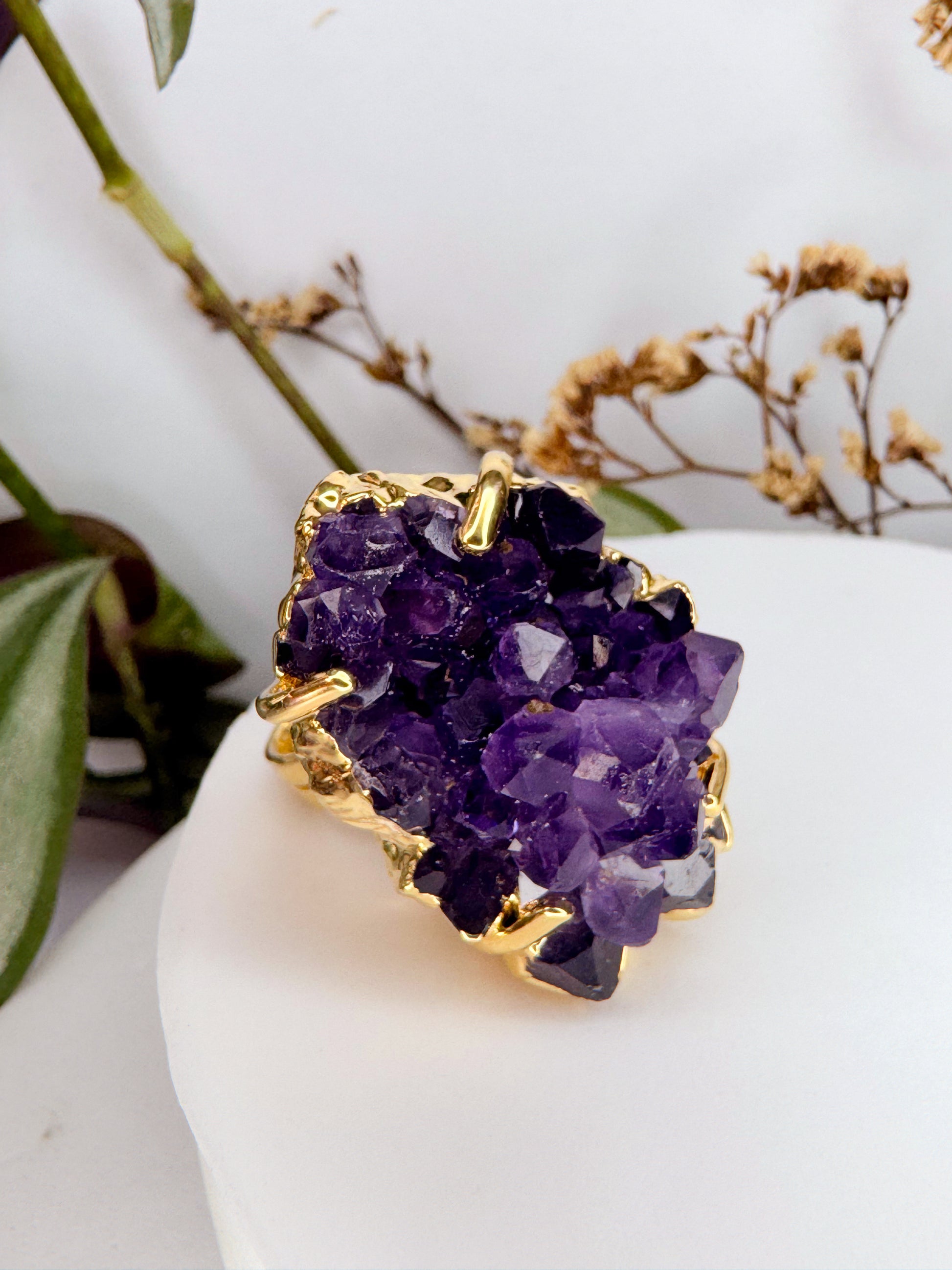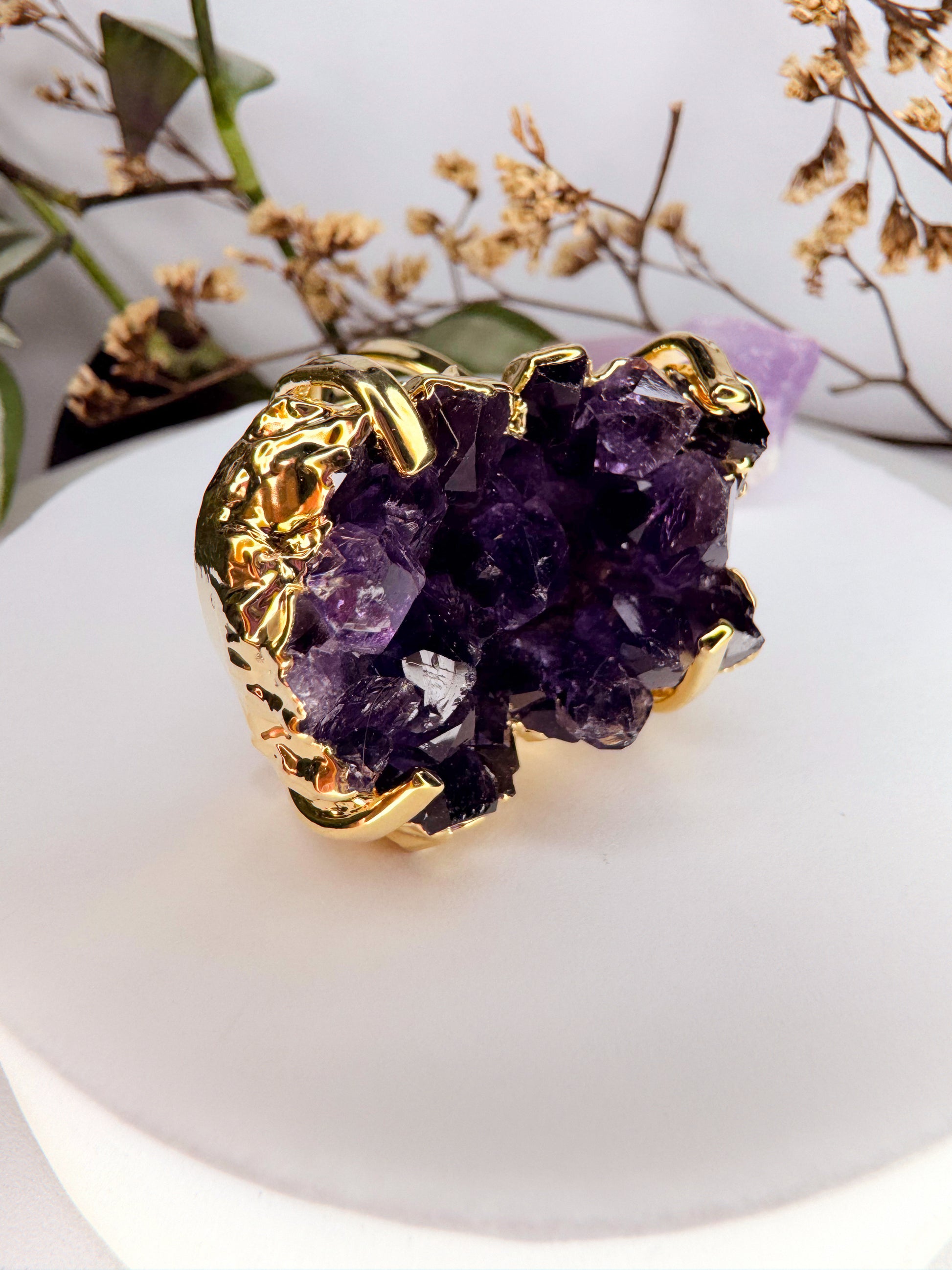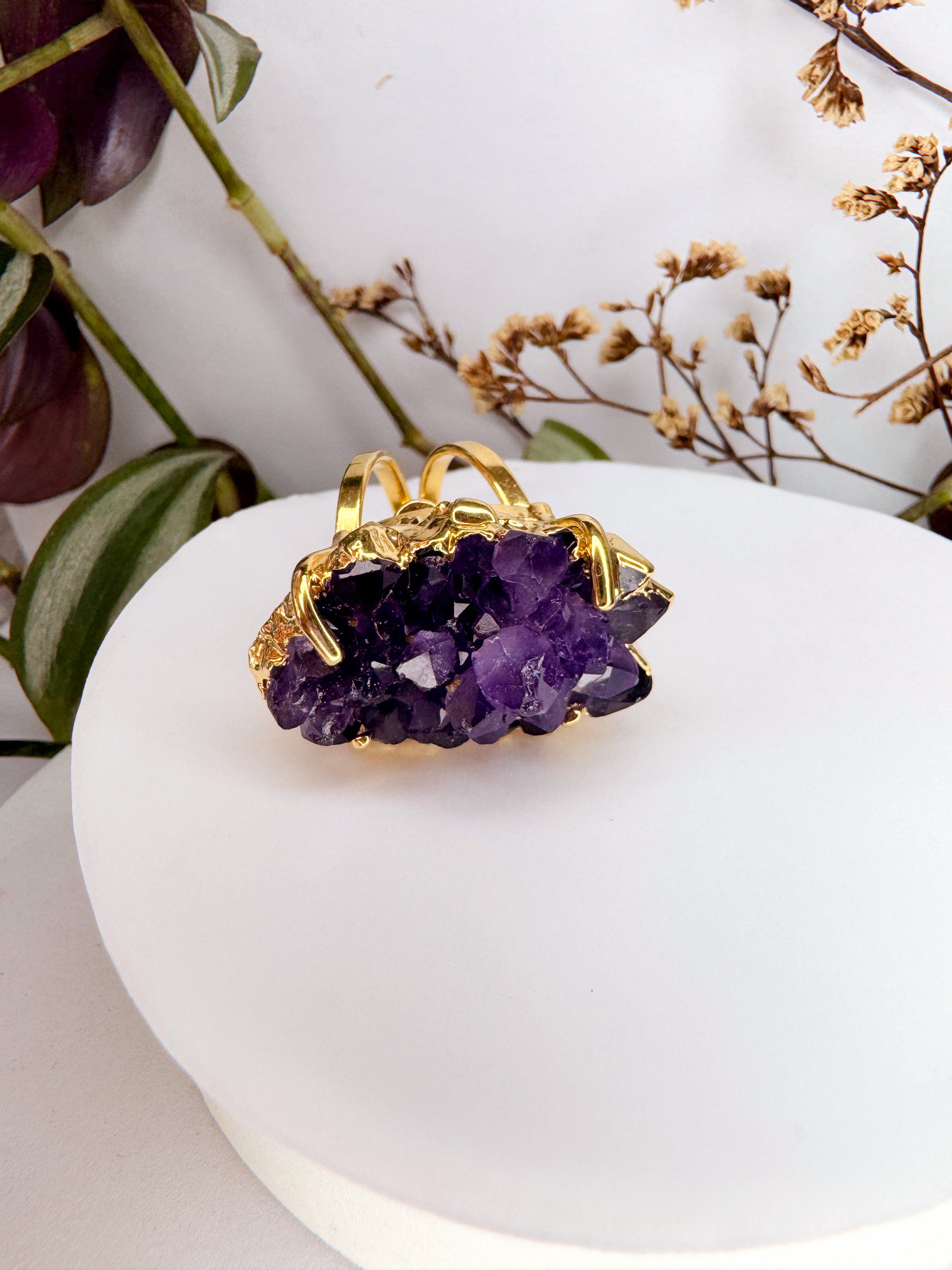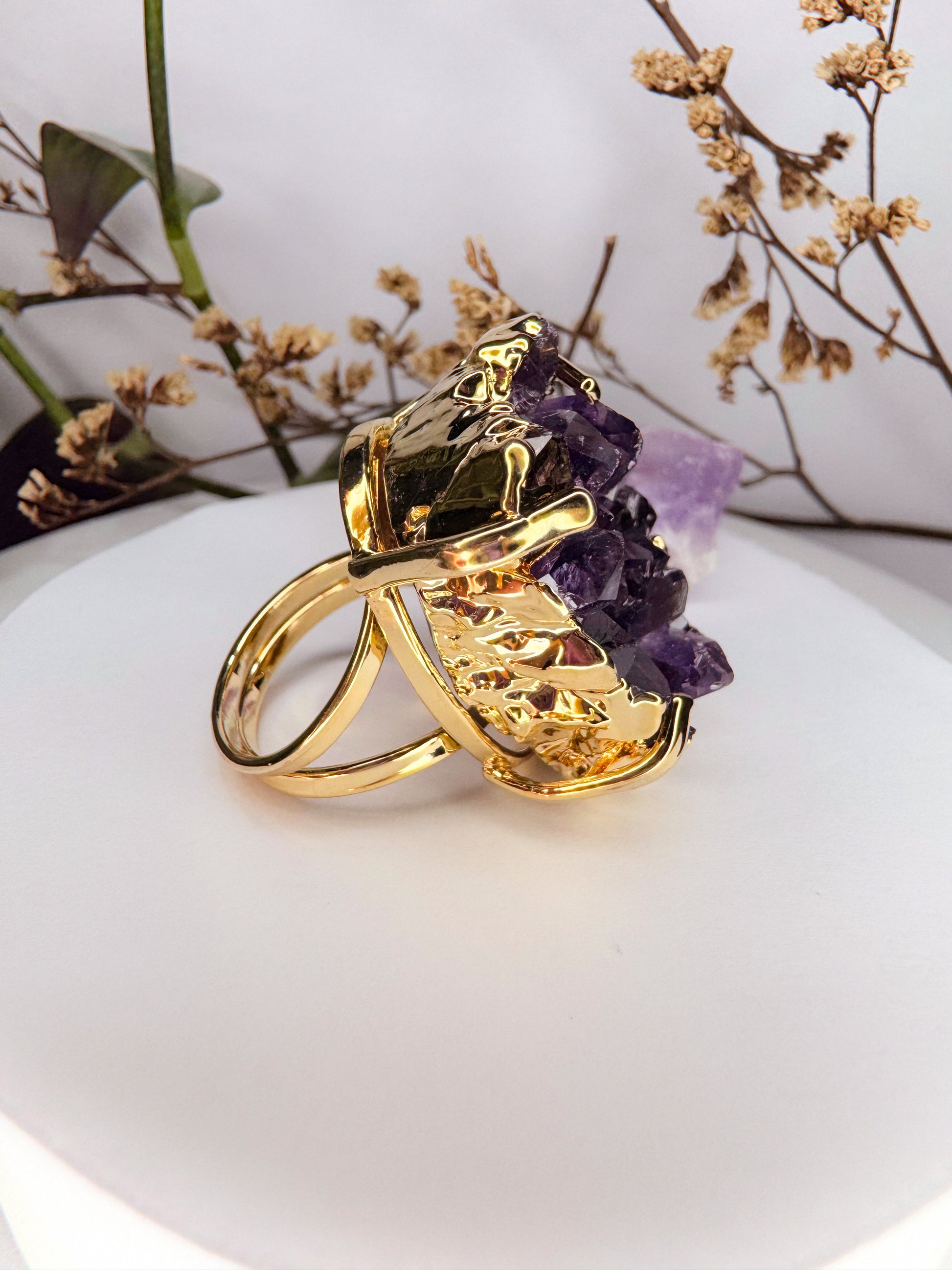 O Anel de Drusa de Ametista é uma joia que carrega toda a força e beleza da natureza em sua forma mais autêntica.