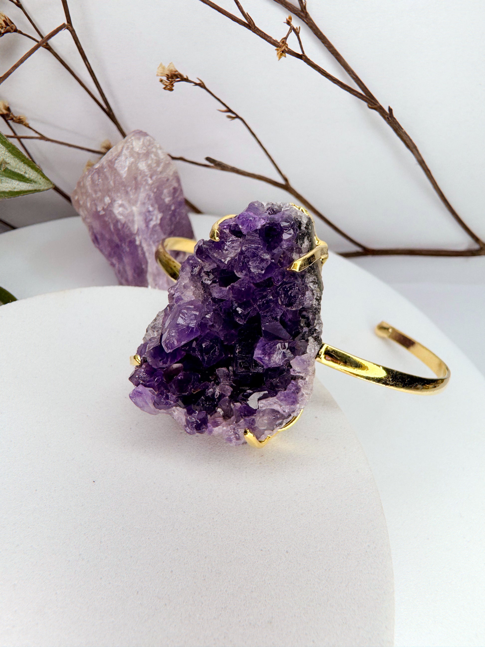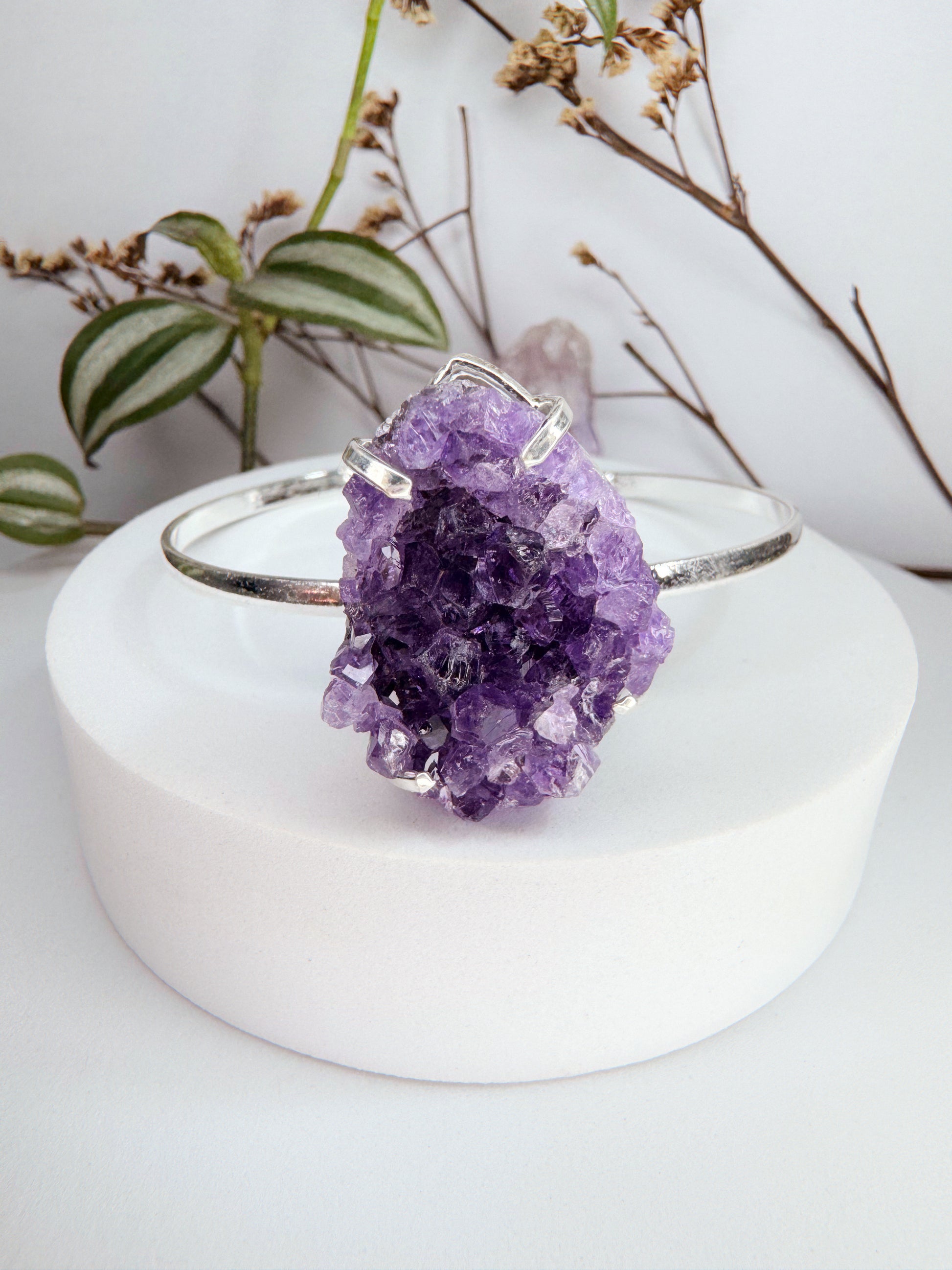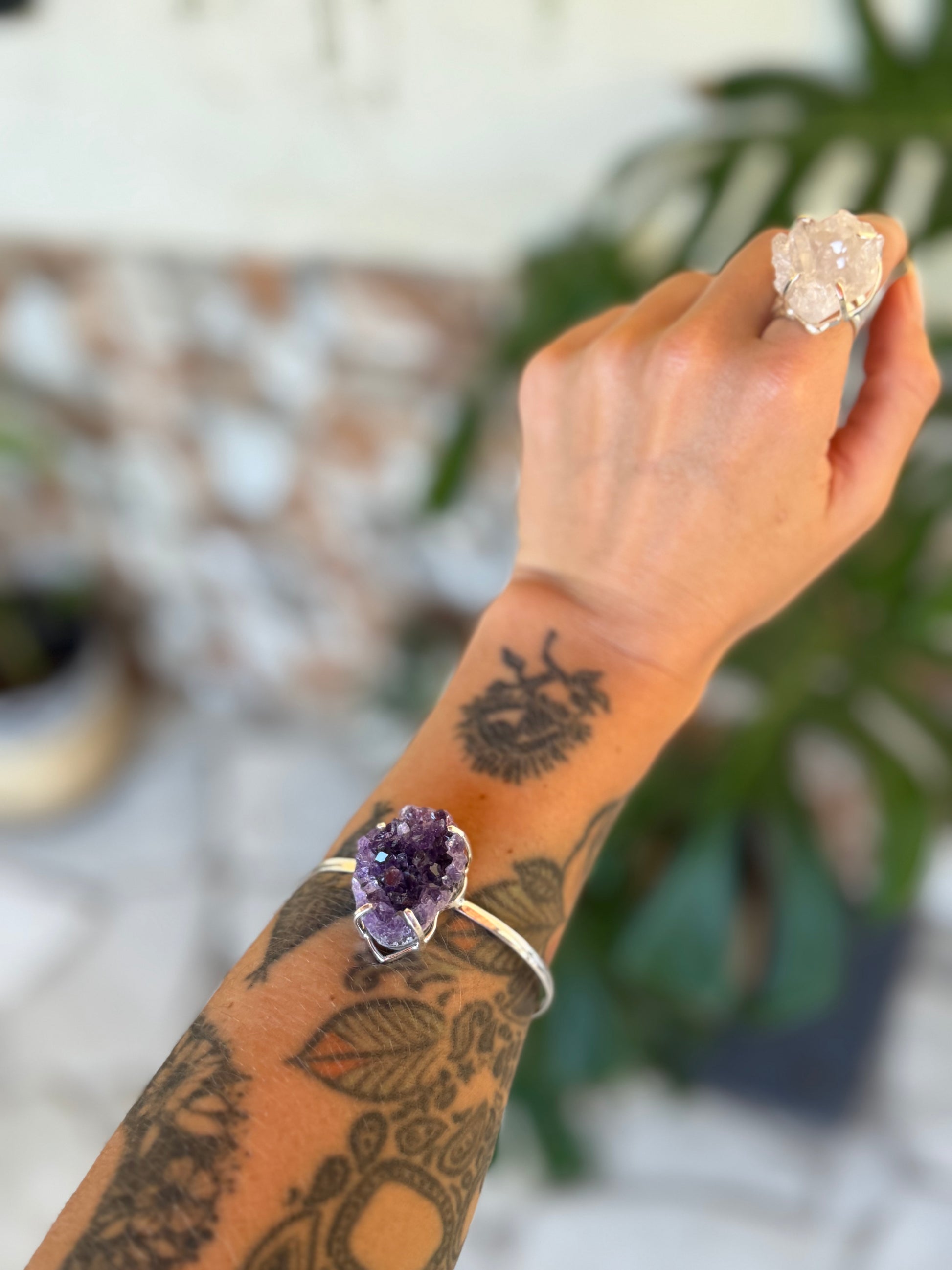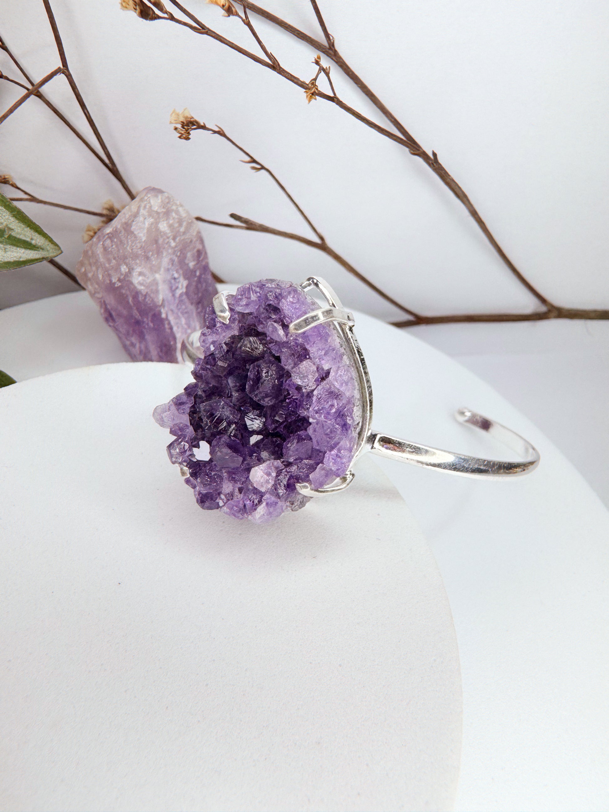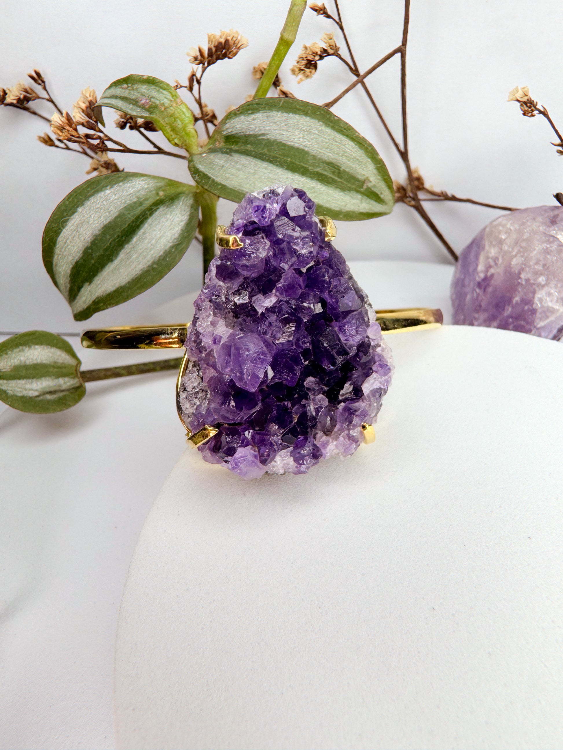 Ametista é um cristal que atua de uma forma clara e poderosa, trabalha com foco na nossa visão de mim pessoal 💛 e também transmuta a energia, de uma insegurança para a coragem! De desequilíbrio para equilíbrio... de ansiedade para acalmar ✨ ainda mais sendo uma drusa, essa que tem várias pontinhas e se distribuiu em um maior campo energético.