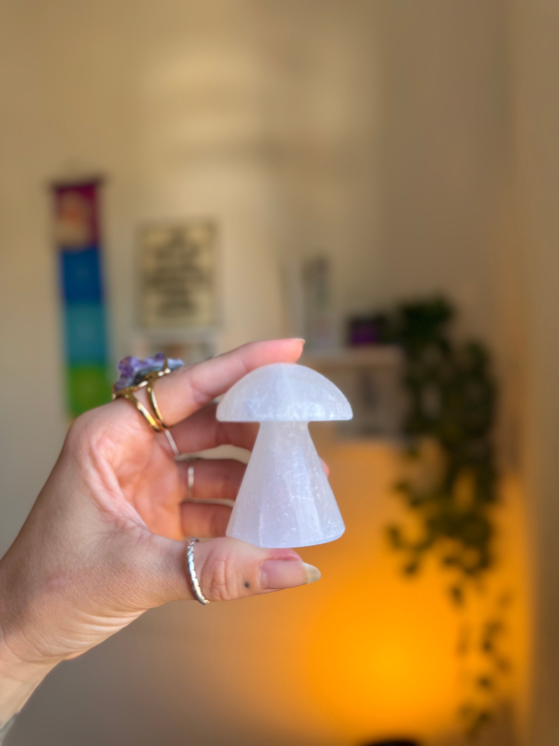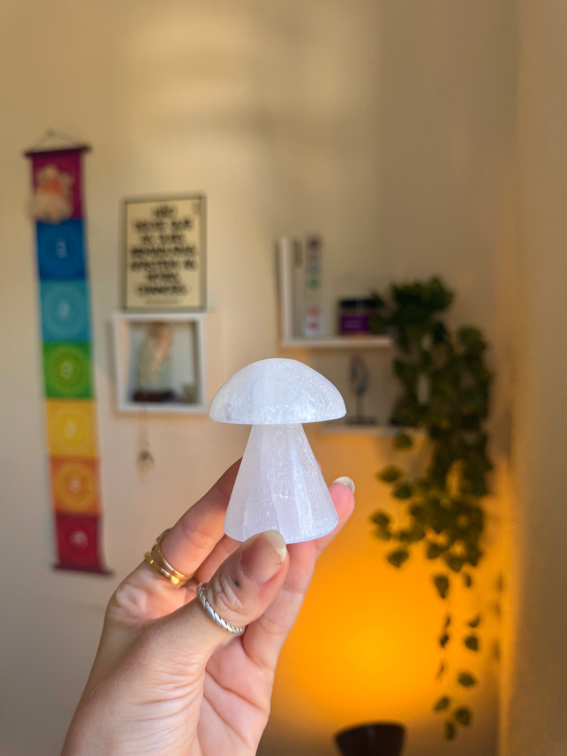 O cogumelo de Selenita Branca, esculpido inteiramente em cristal natural, é uma peça que irradia leveza, paz e limpeza energética. A Selenita Branca emana uma energia sutil e elevada, ajudando a purificar o ambiente, acalmar a mente e elevar a vibração do espaço.