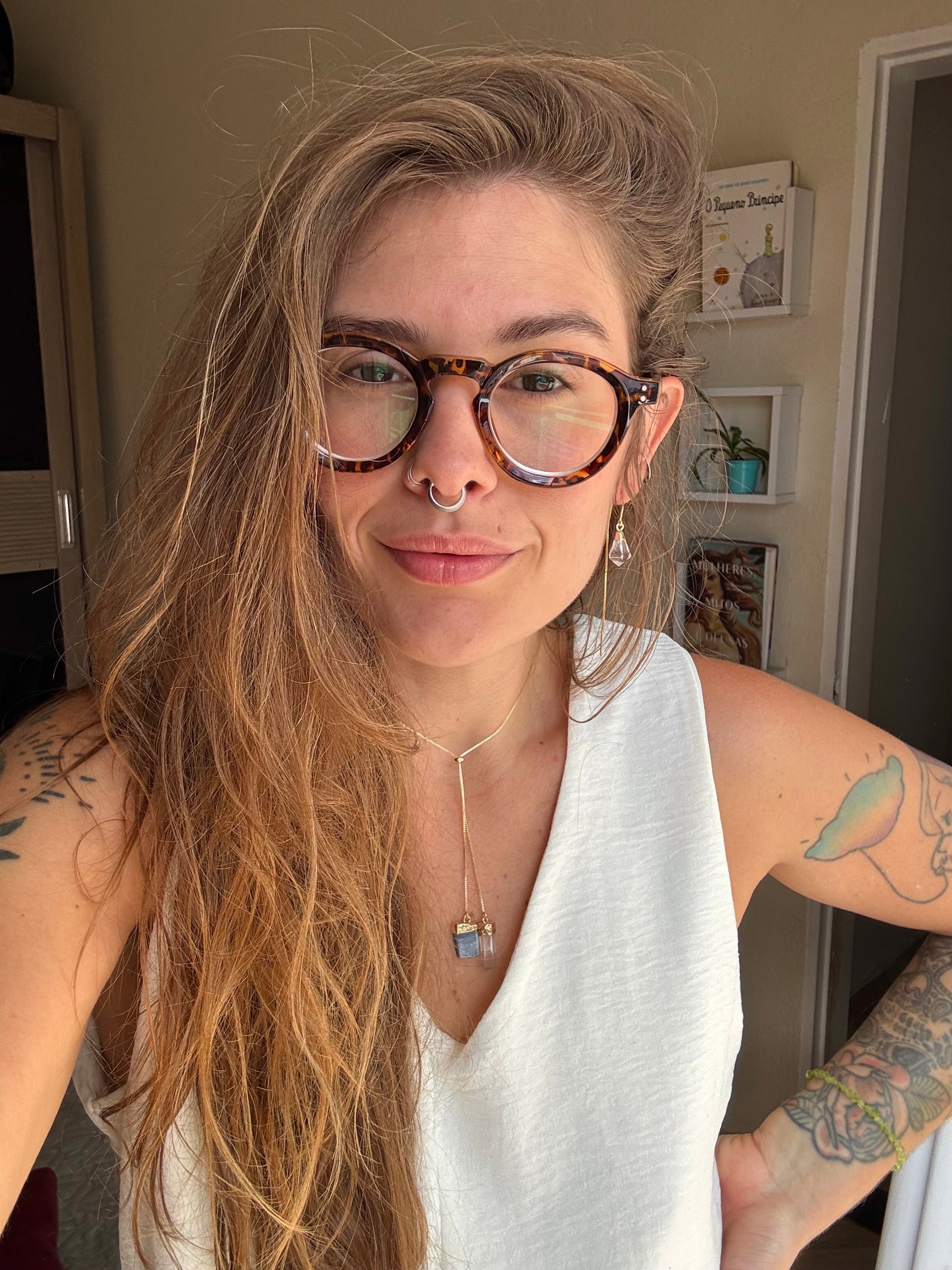 O colar gravatinha de Quartzo de Cristal e Cianita Azul combina duas forças poderosas da natureza em uma peça delicada e cheia de significado. O Quartzo de Cristal emana luz, amplificando boas energias e purificando o campo ao redor, enquanto a Cianita Azul traz calma, proteção e alinhamento energético.