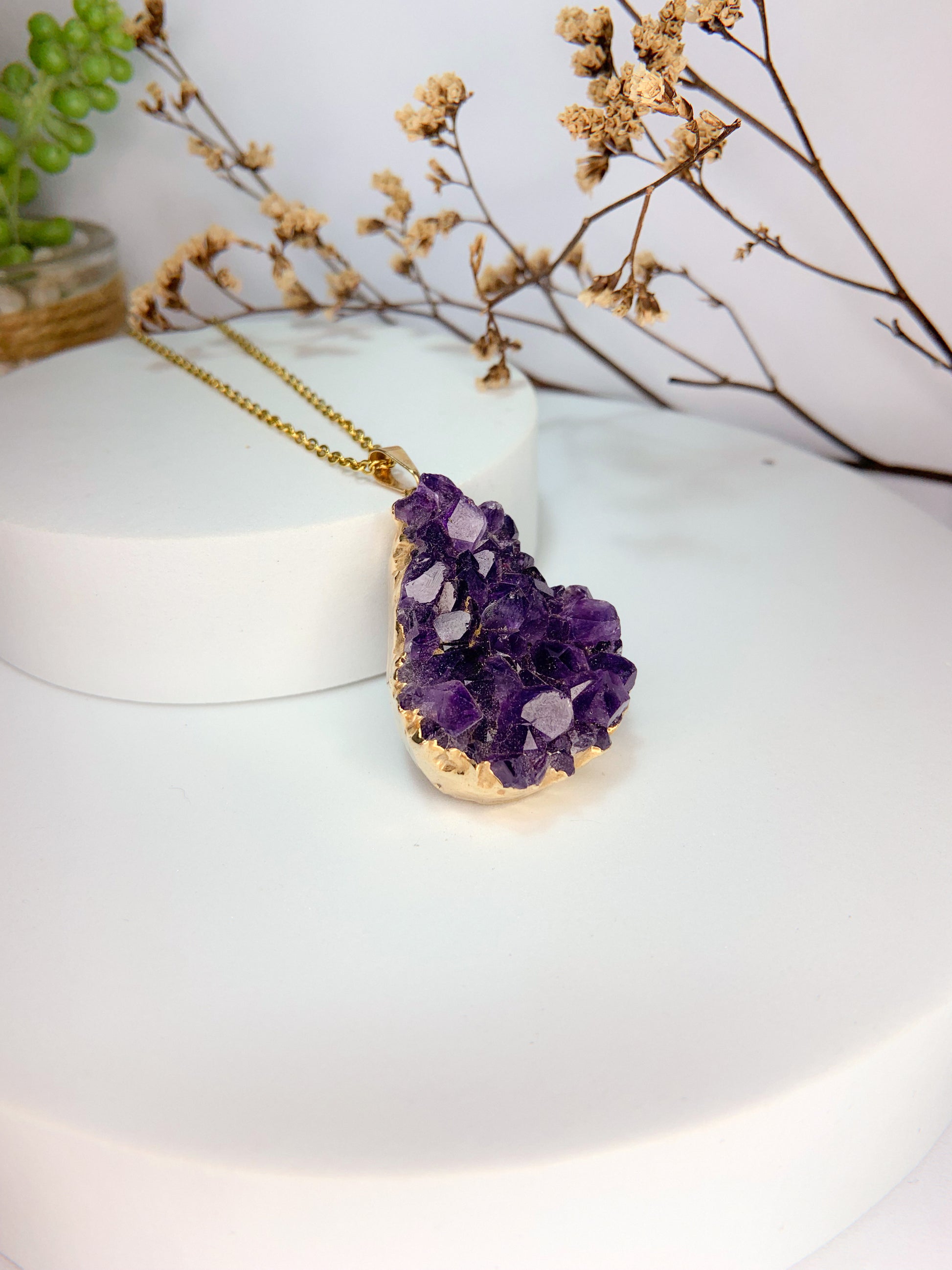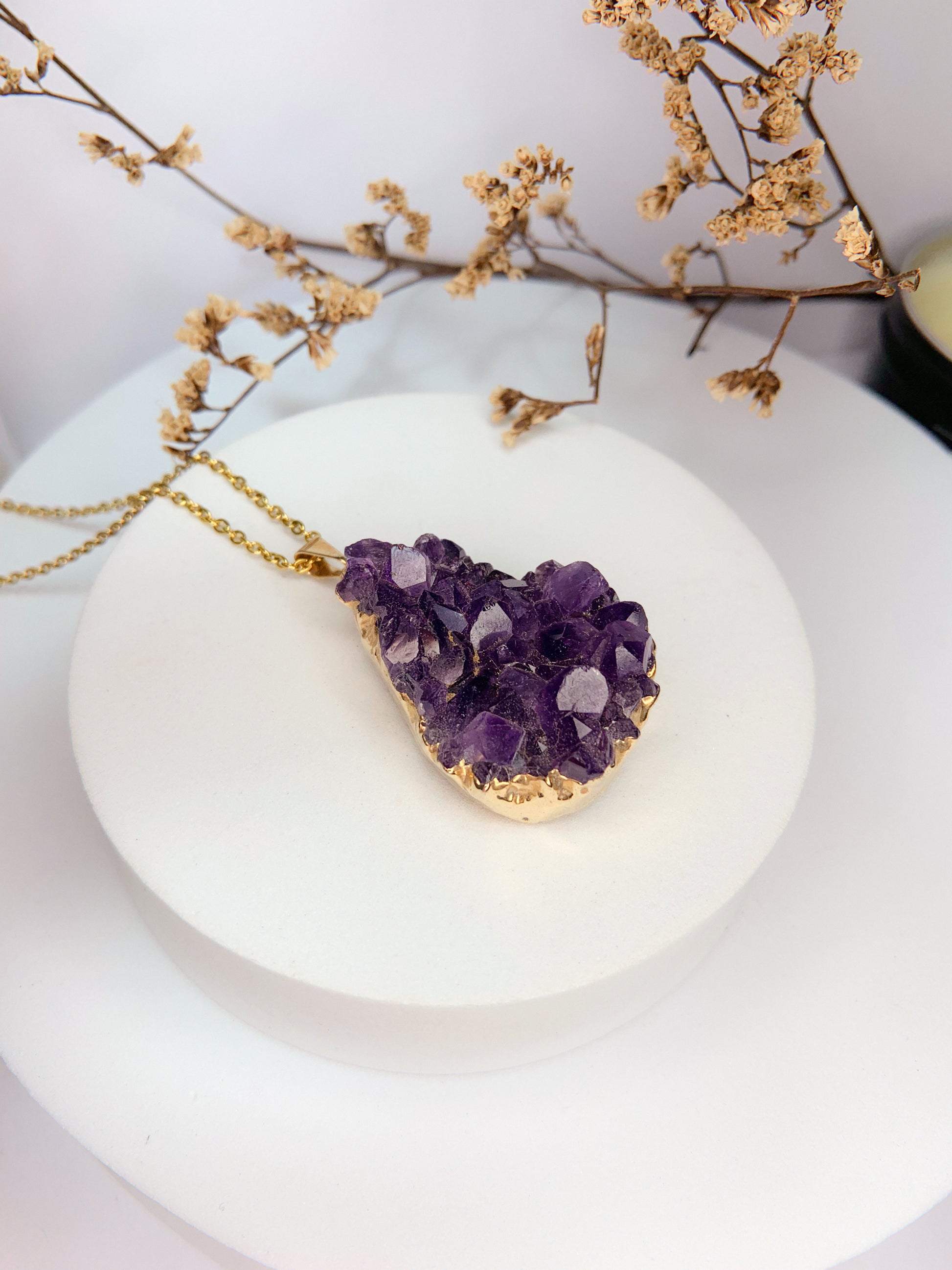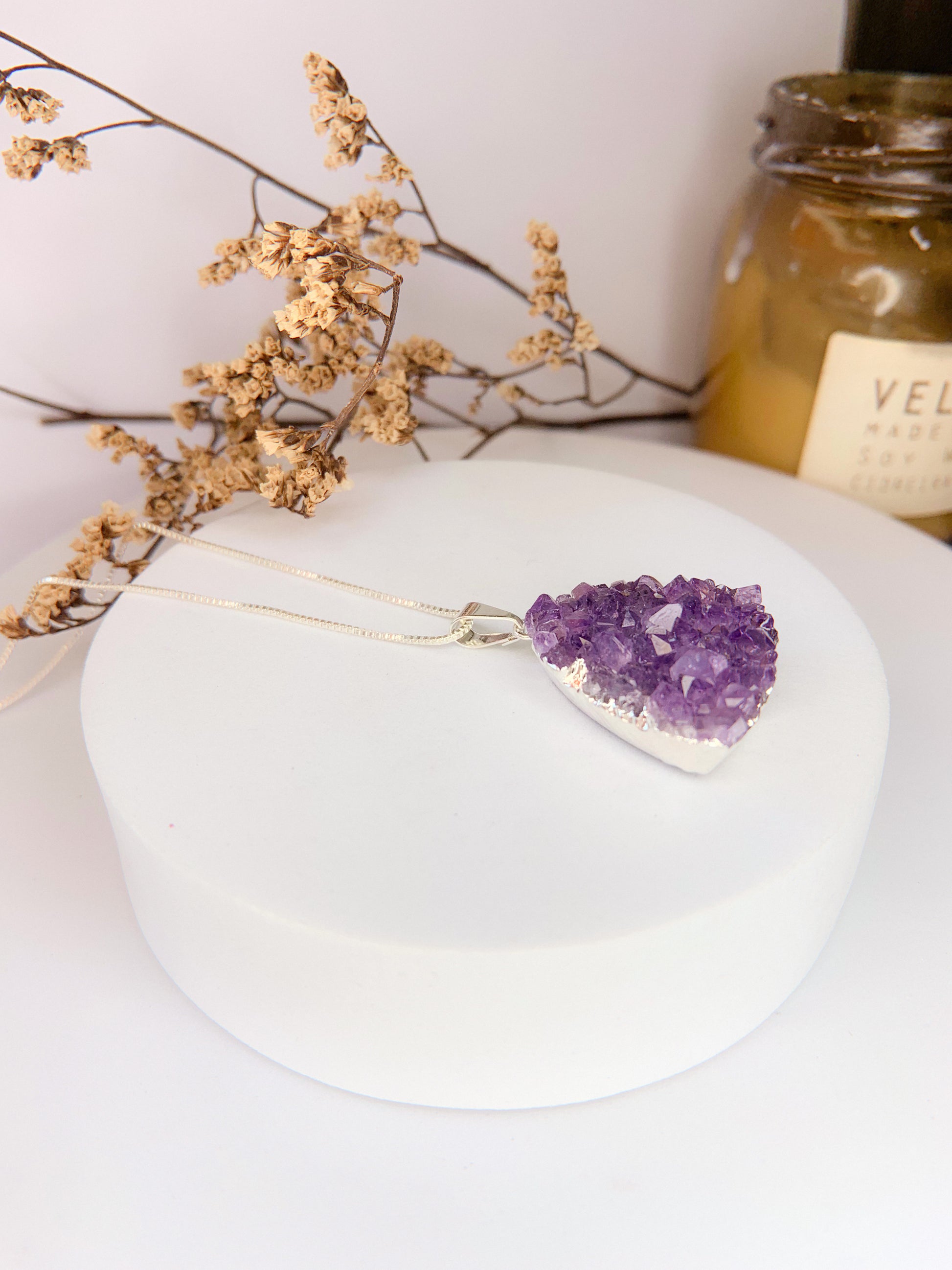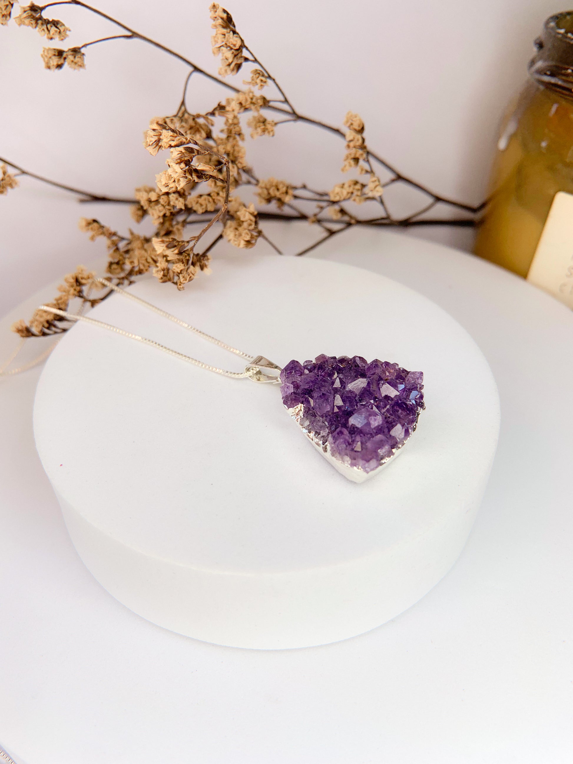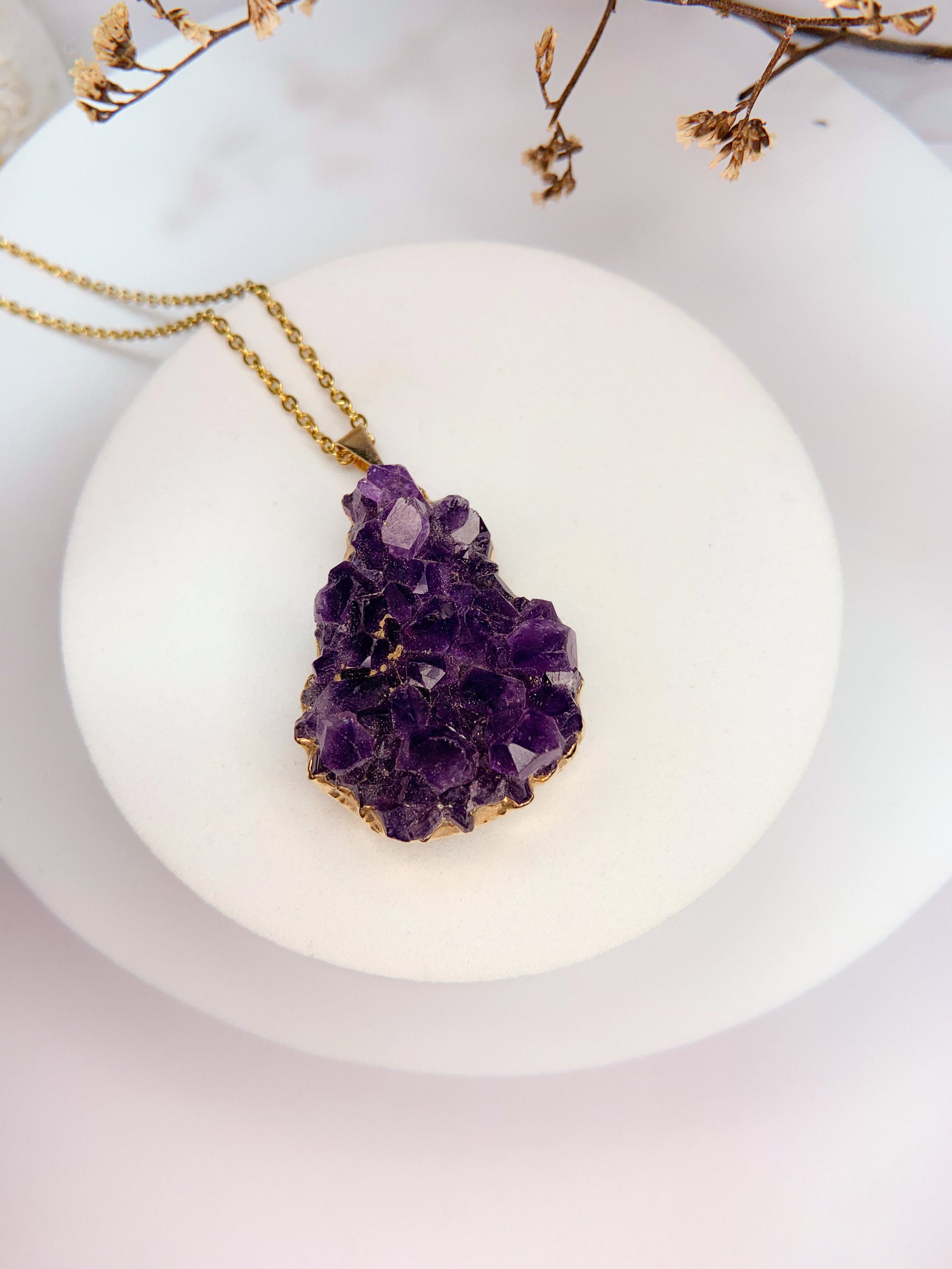 Ametista é um cristal que atua de uma forma clara e poderosa, trabalha com foco na nossa visão de eu pessoal 💛 e também transmuta a energia, de uma insegurança para coragem! De desequilíbrio para equilíbrio... de ansiedade para calmaria ✨ ainda mais sendo uma drusa, essa que tem várias pontinhas e distribuiu em um maior campo energético.