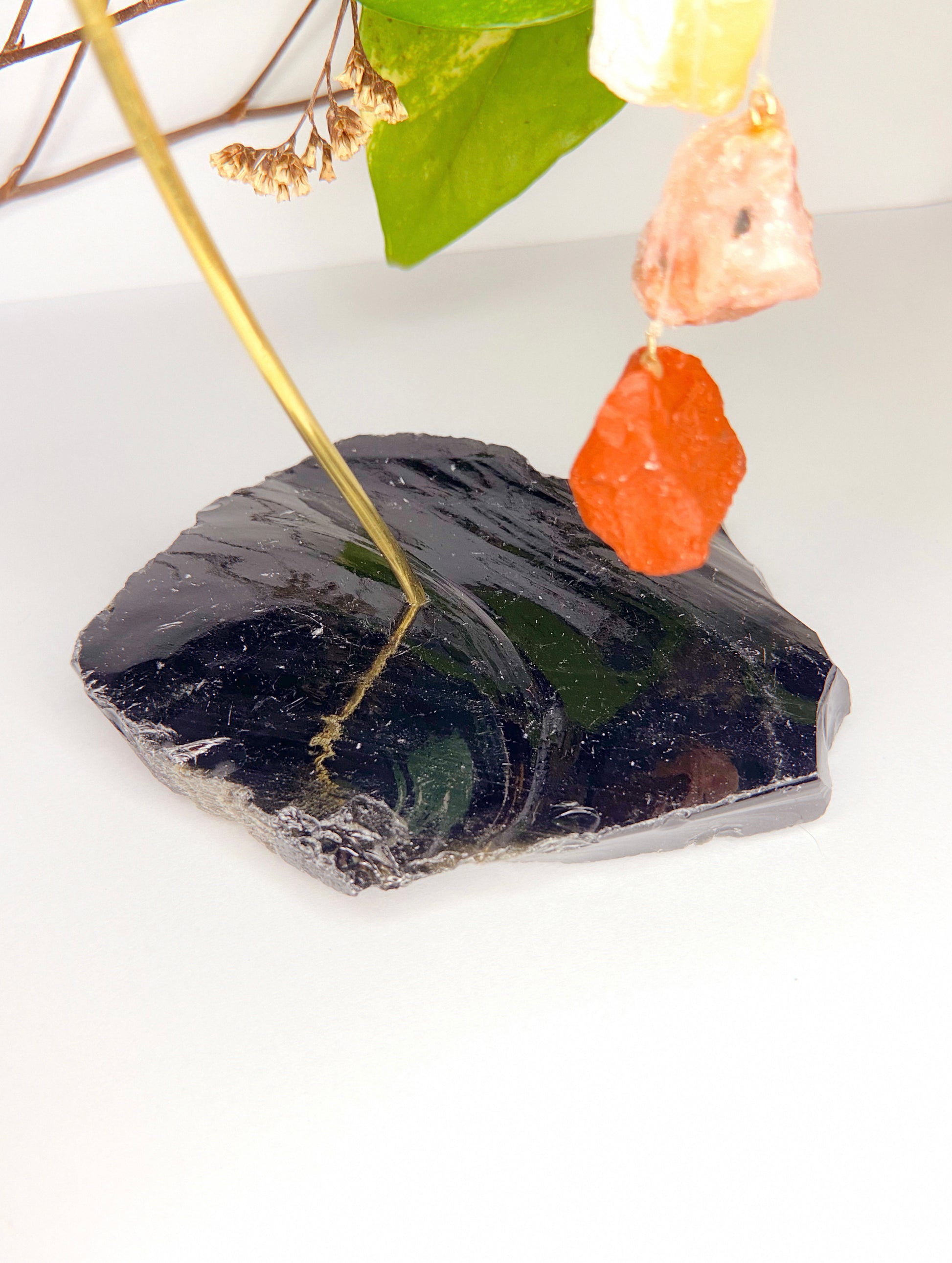 Este sino de mesa tem sua base em Obsidiana Negra, um dos cristais mais fortes de proteção. Conhecida por sua capacidade de cortar energias negativas, afastar influências indesejadas, a Obsidiana é ideal para quem deseja manter o ambiente seguro, limpo e centrado.