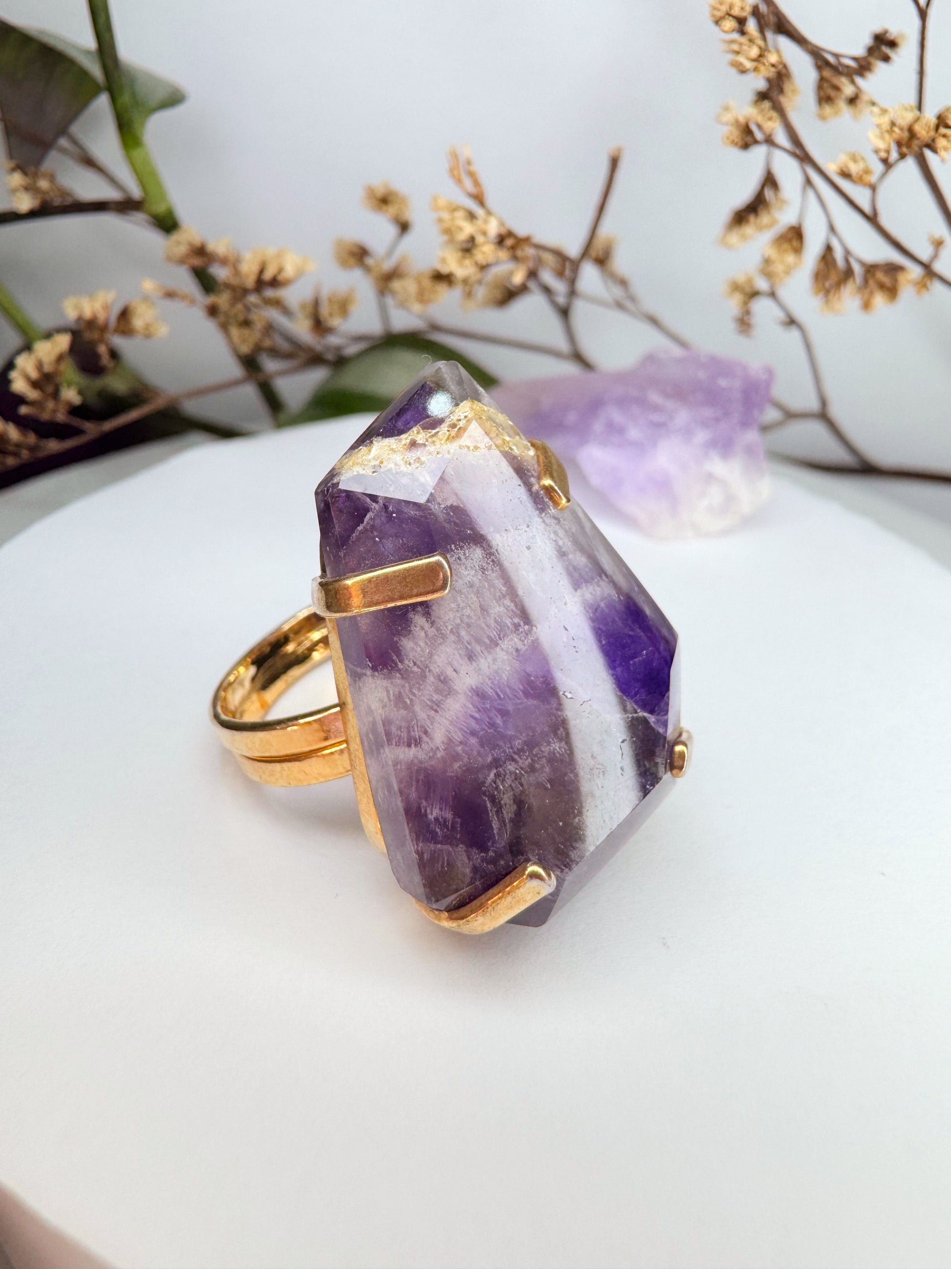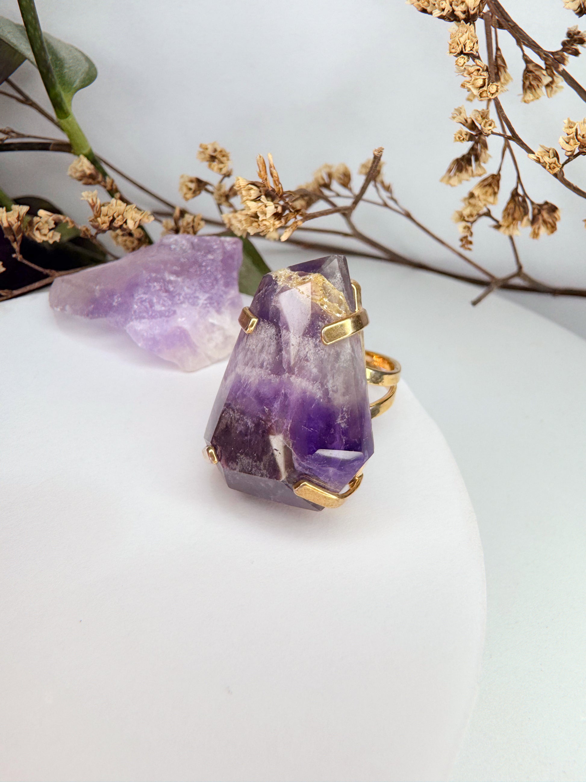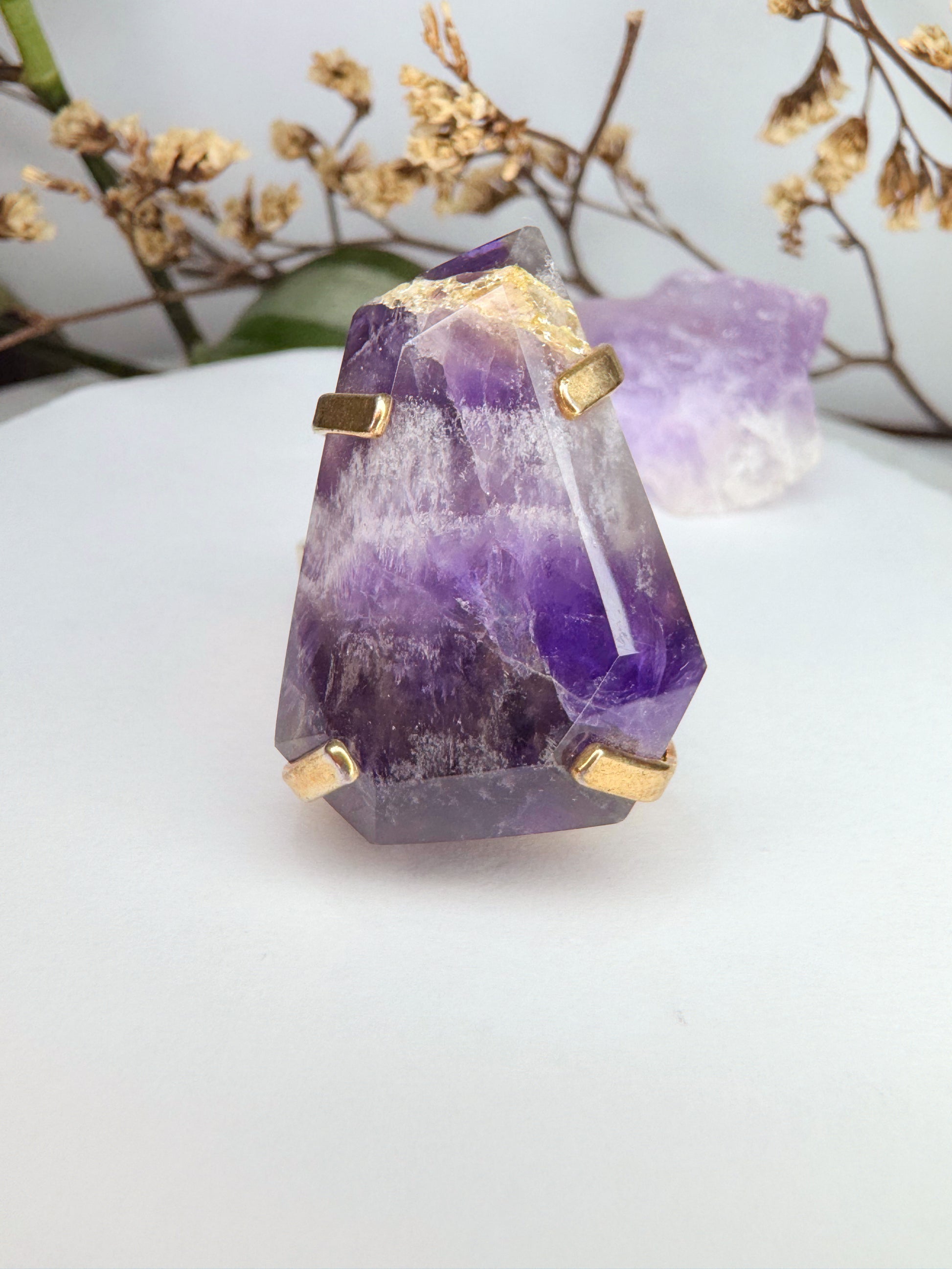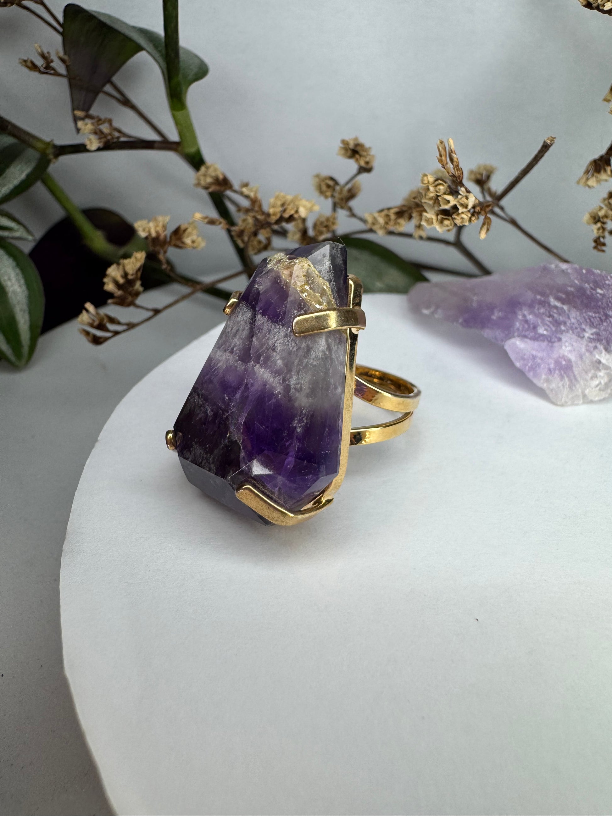 O Anel de Ametista Lapidada une elegância e energia em uma peça atemporal.