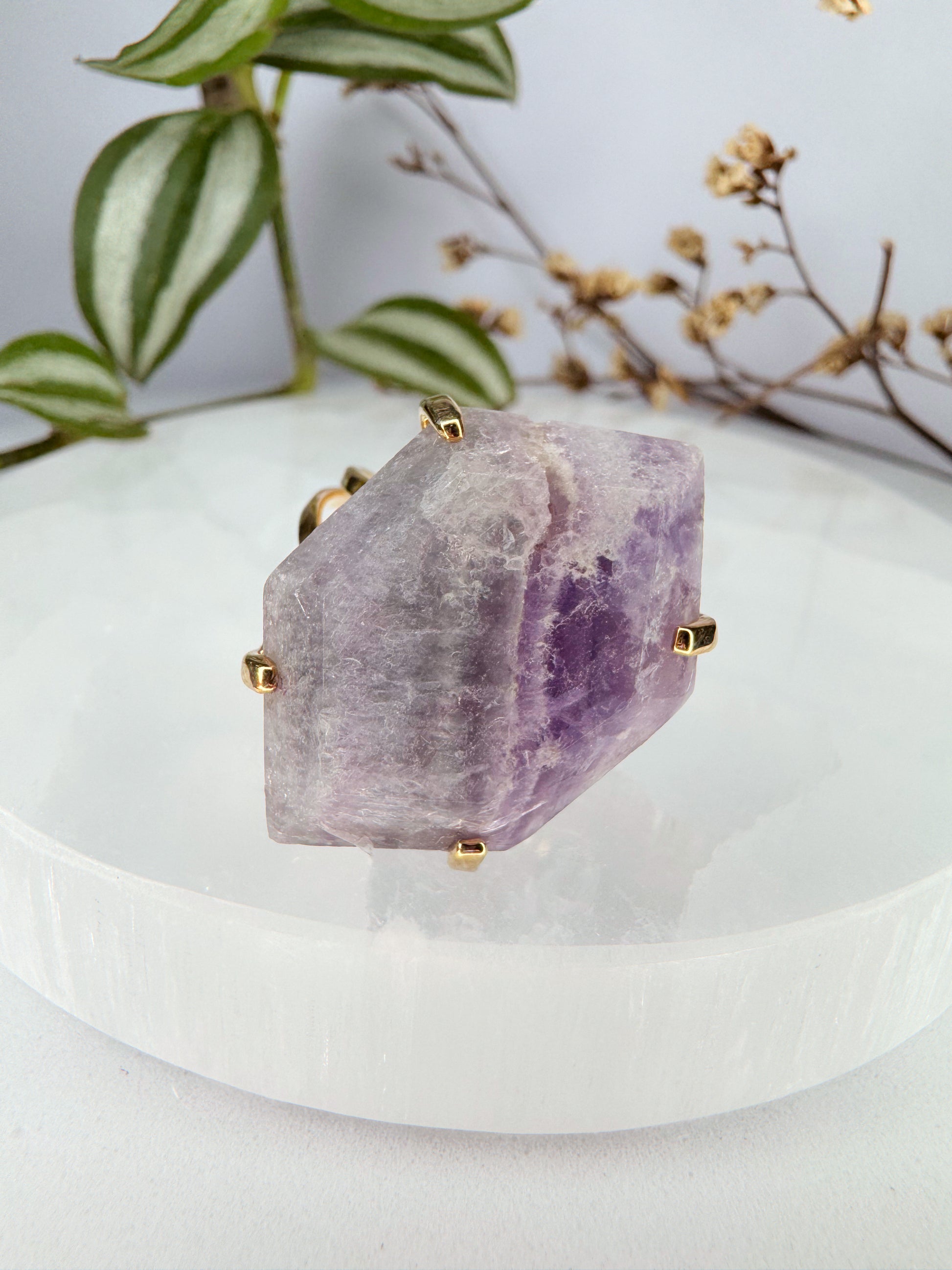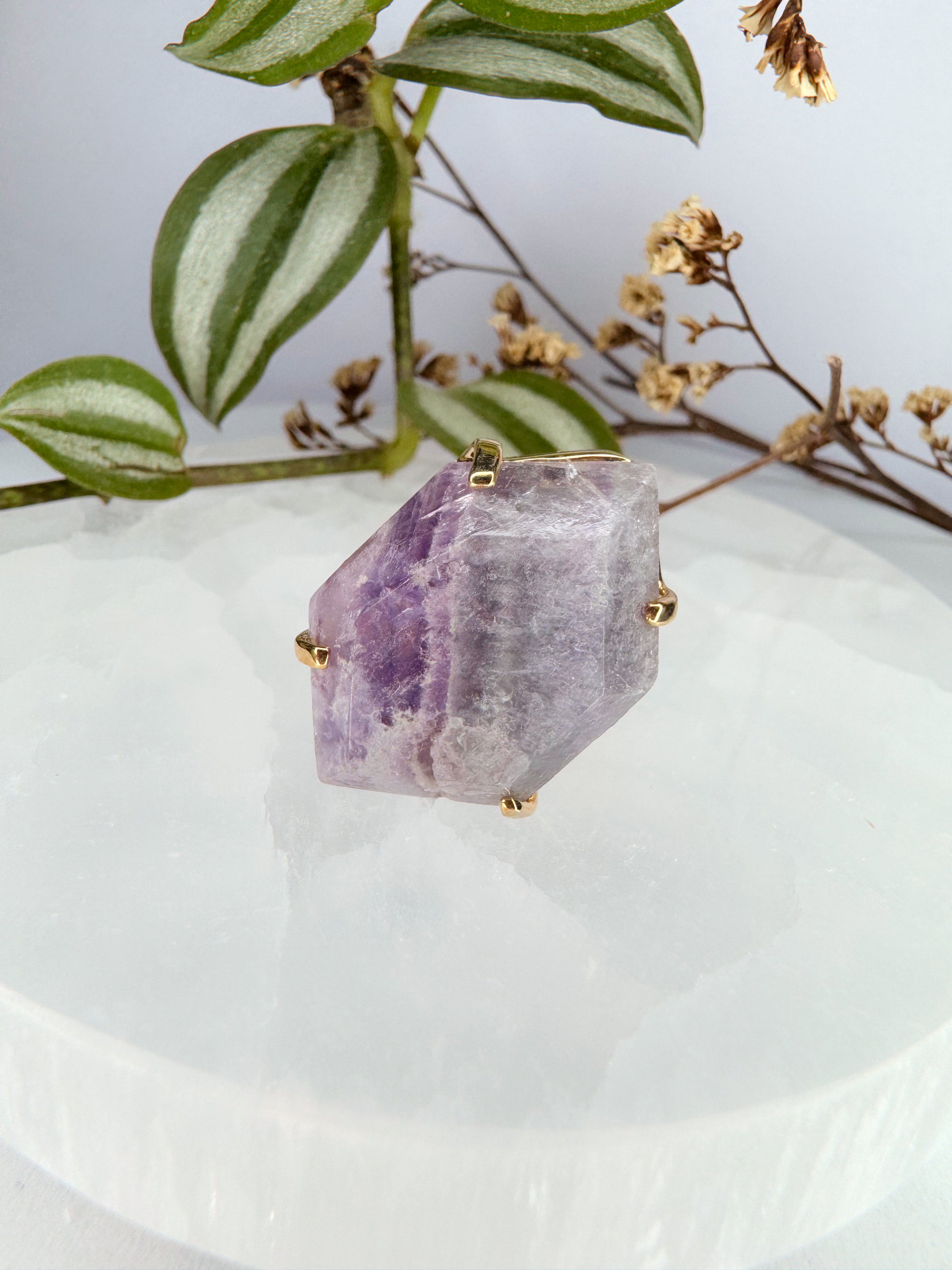 O Anel de Ametista Lapidada une elegância e energia em uma peça atemporal.