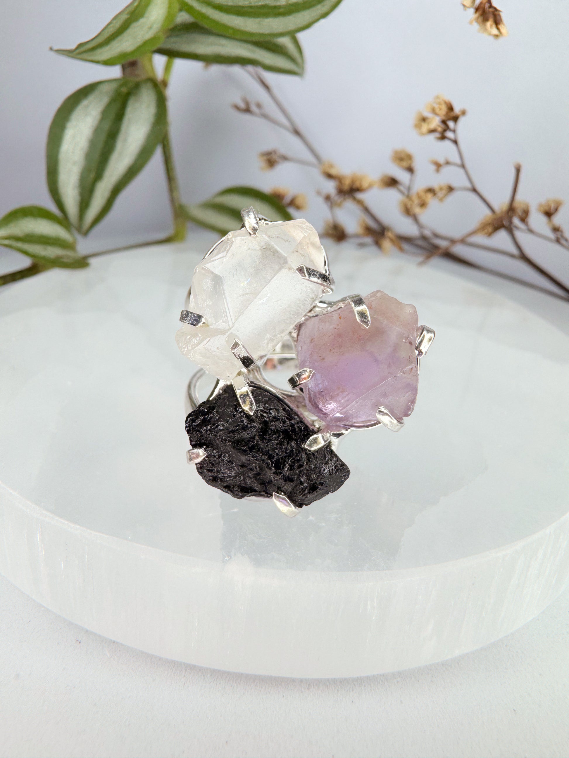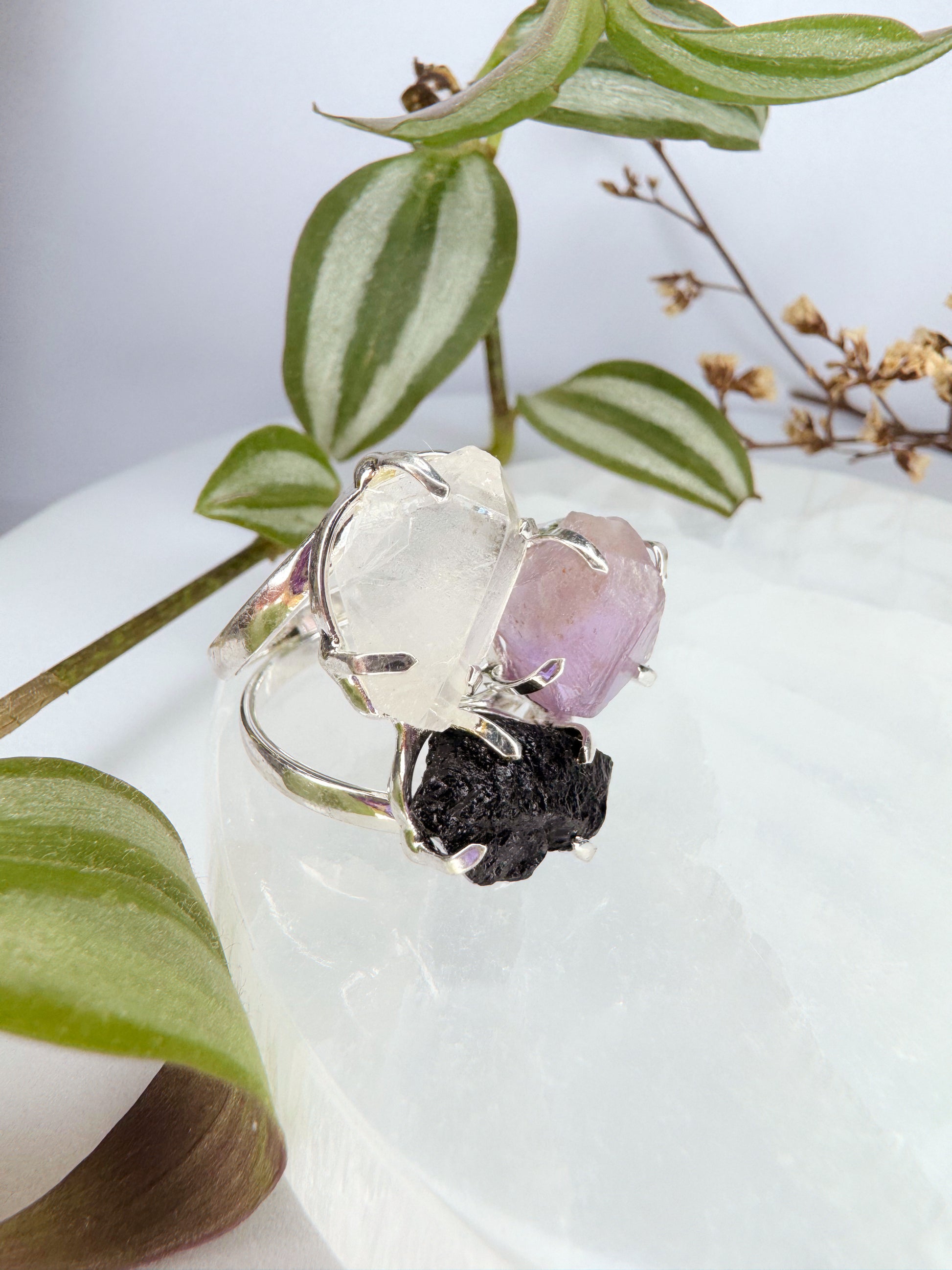 Anel Tríplice - Ametista, Turmalina Preta e Quartzo de cristal