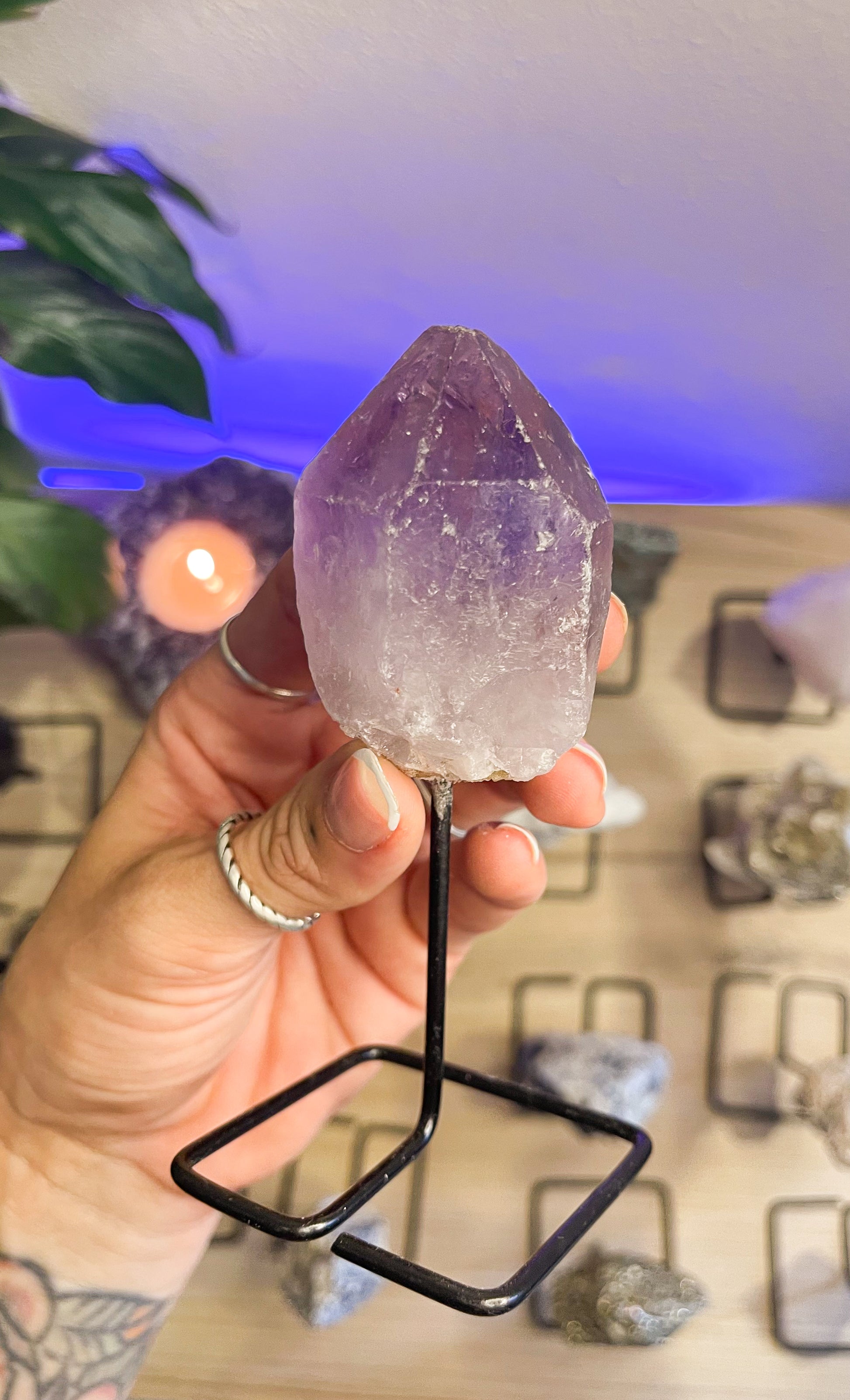 A Ametista é o cristal da espiritualidade, da proteção e da serenidade. Sua energia elevada purifica o ambiente, afasta energias negativas e promove um estado de calma e equilíbrio.