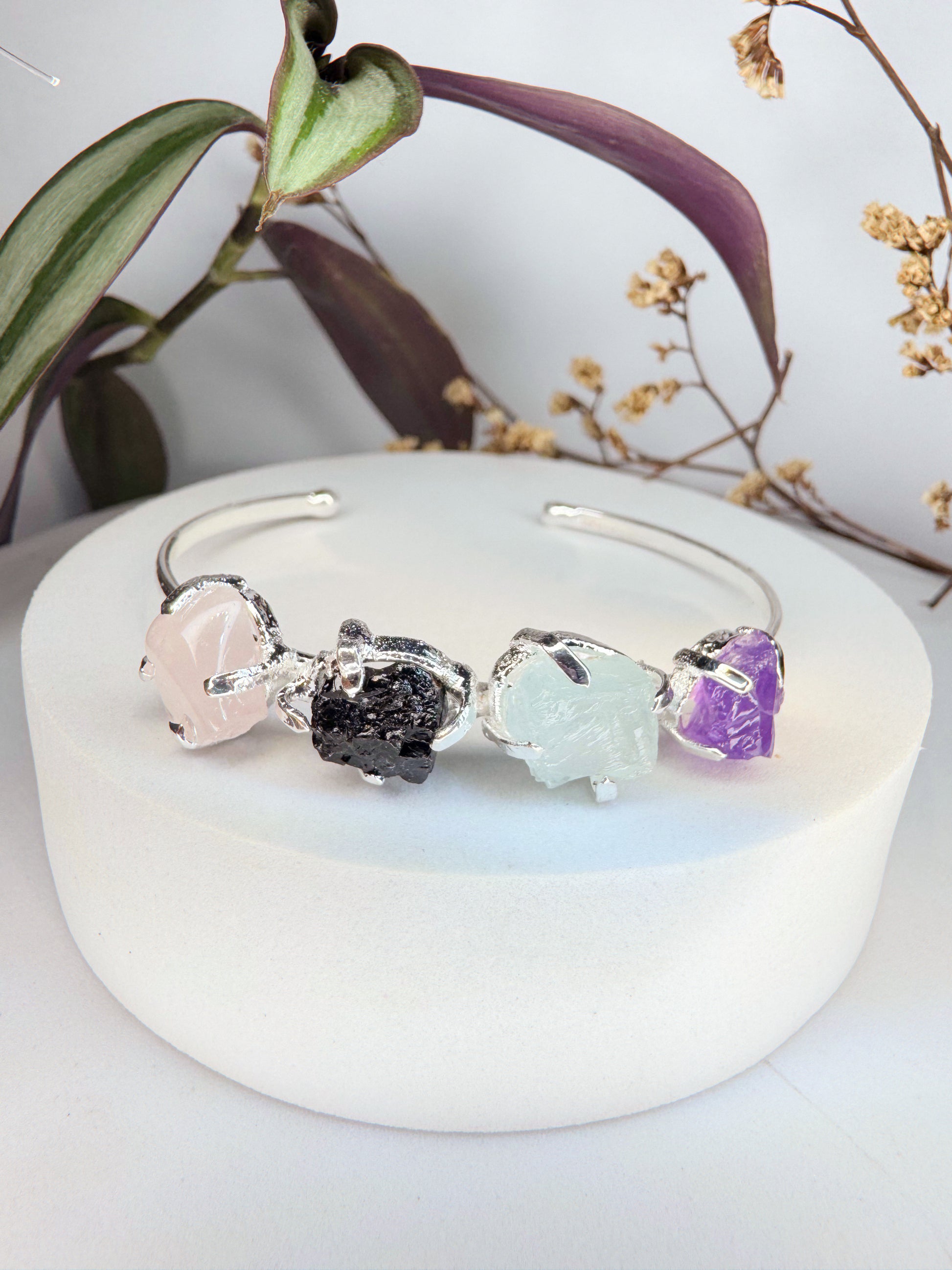 Composição com 4 cristais naturais: Quartzo Rosa, Turmalina, Água-Marinha e Ametista