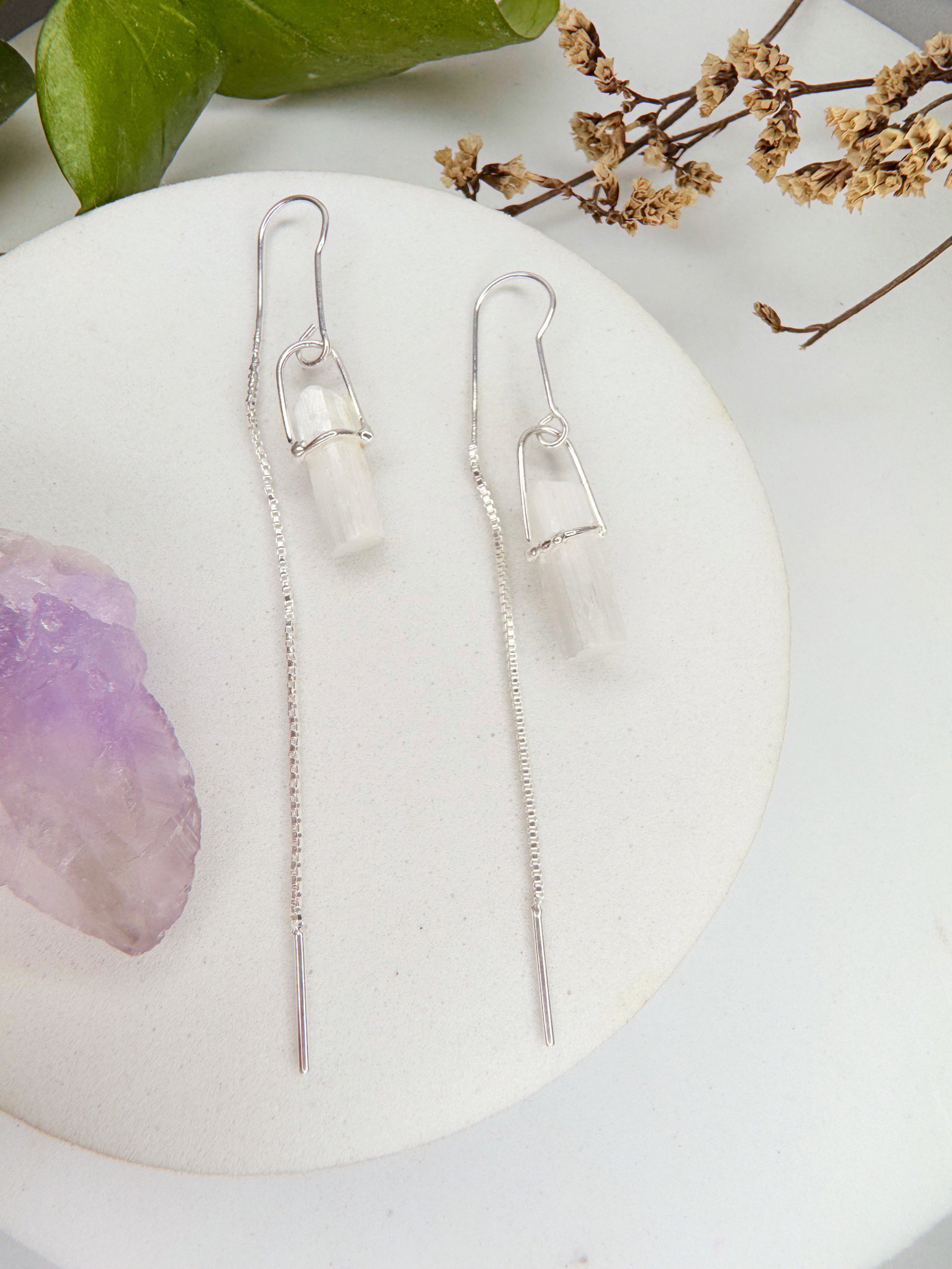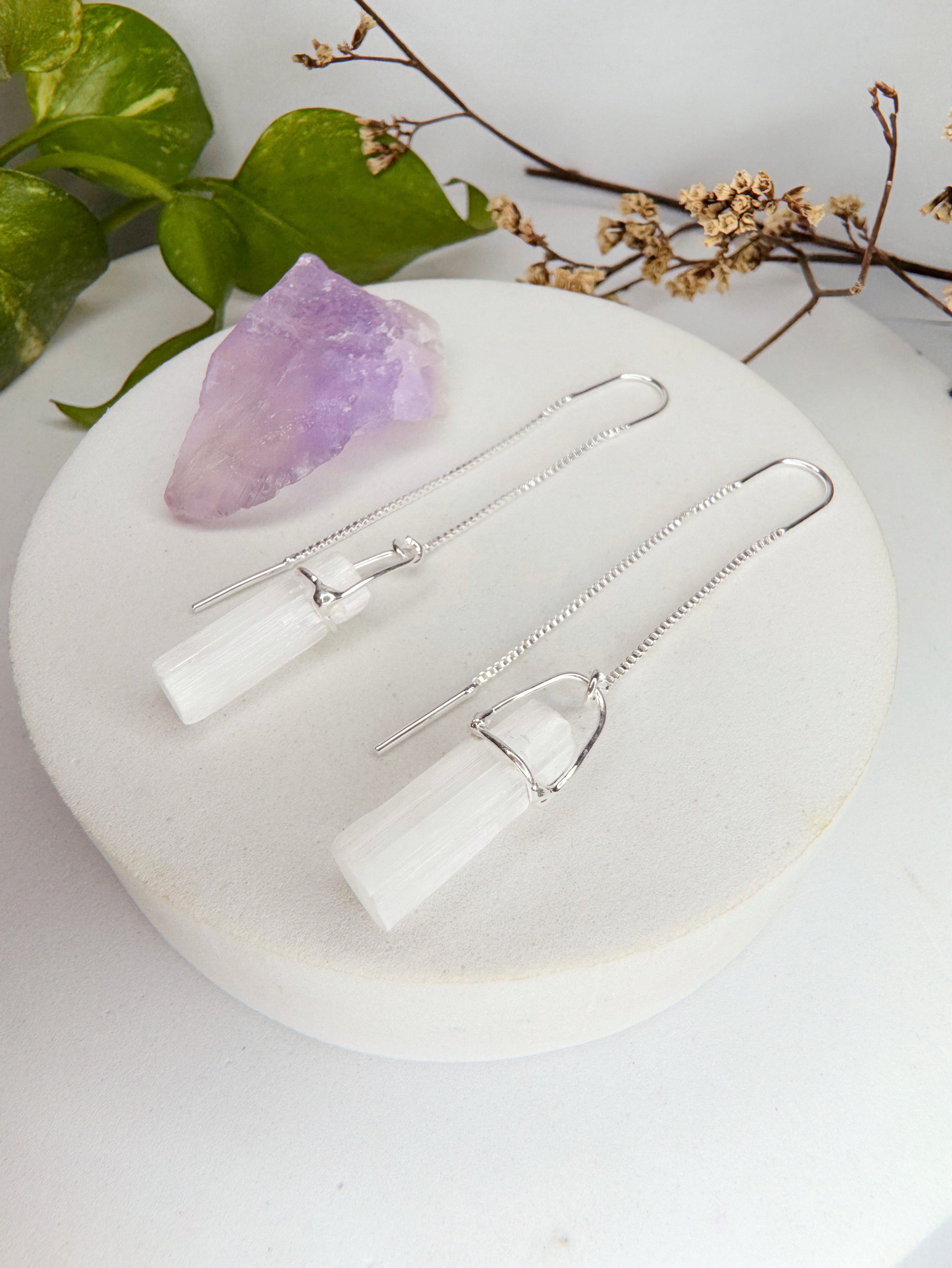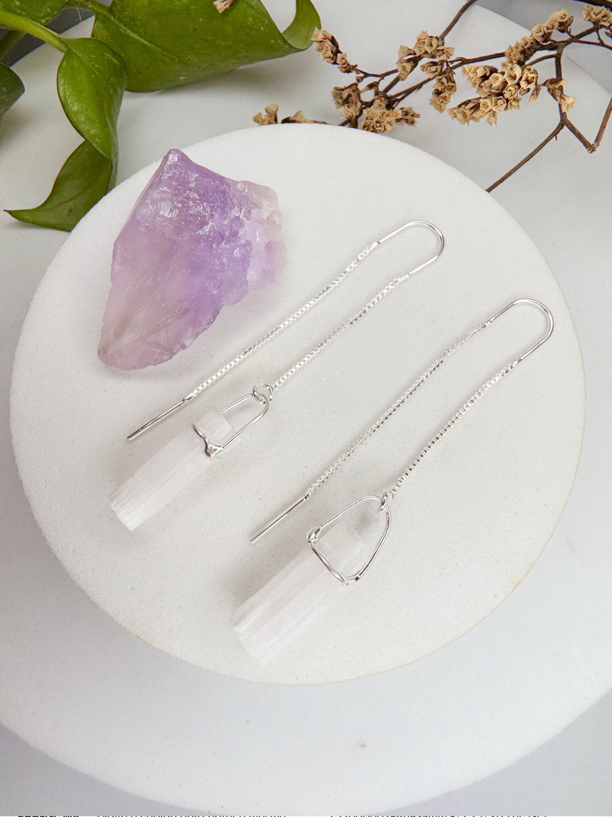 Nosso Brinco zen de Selenita Branca une à força da natureza com uma peça leve e sofisticada, ideal para quem busca elegância com propósito.