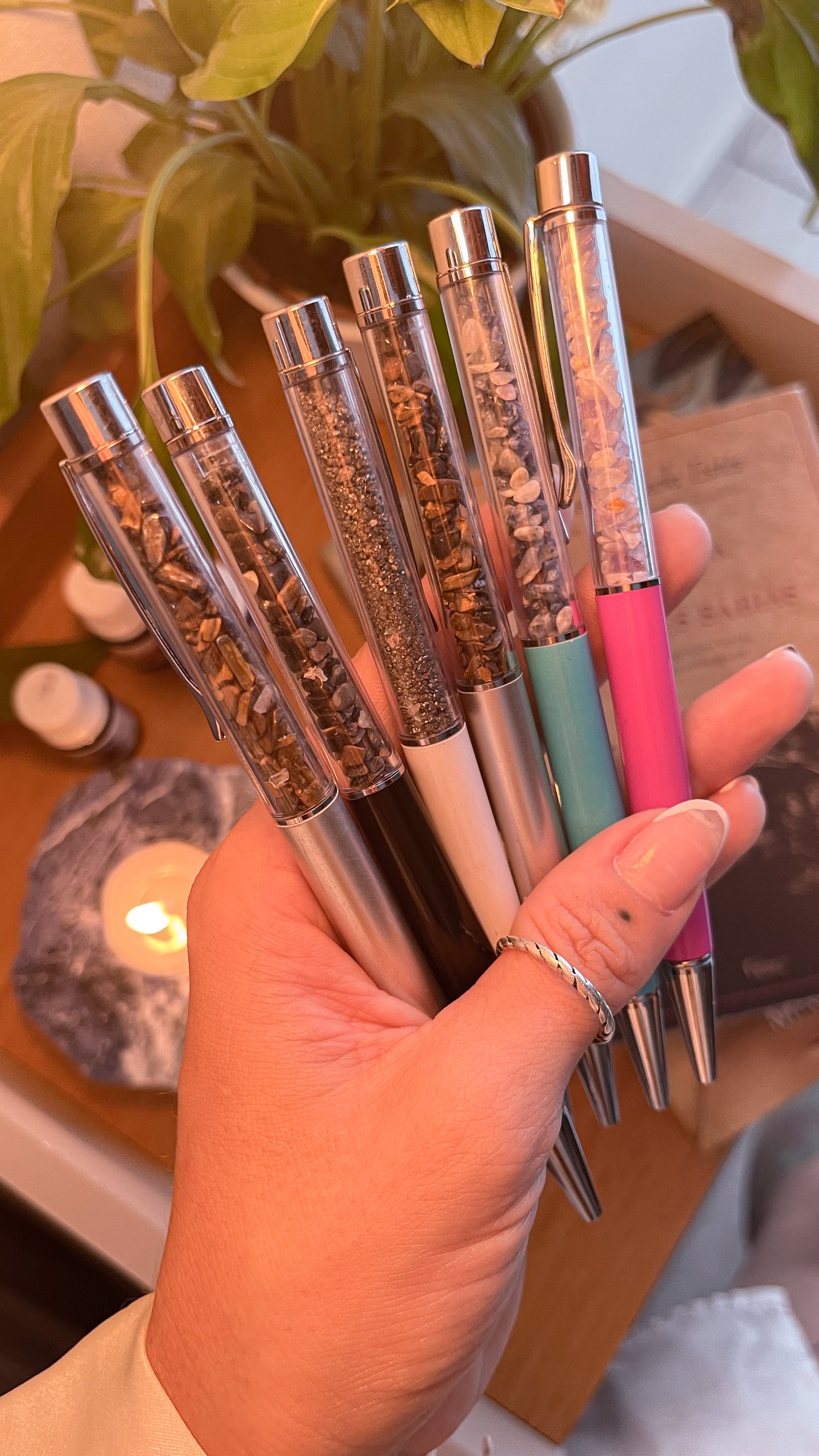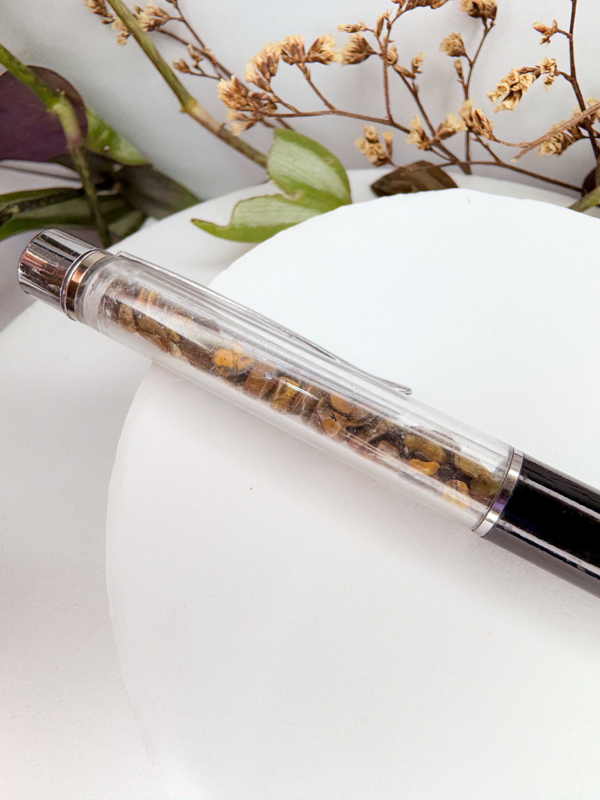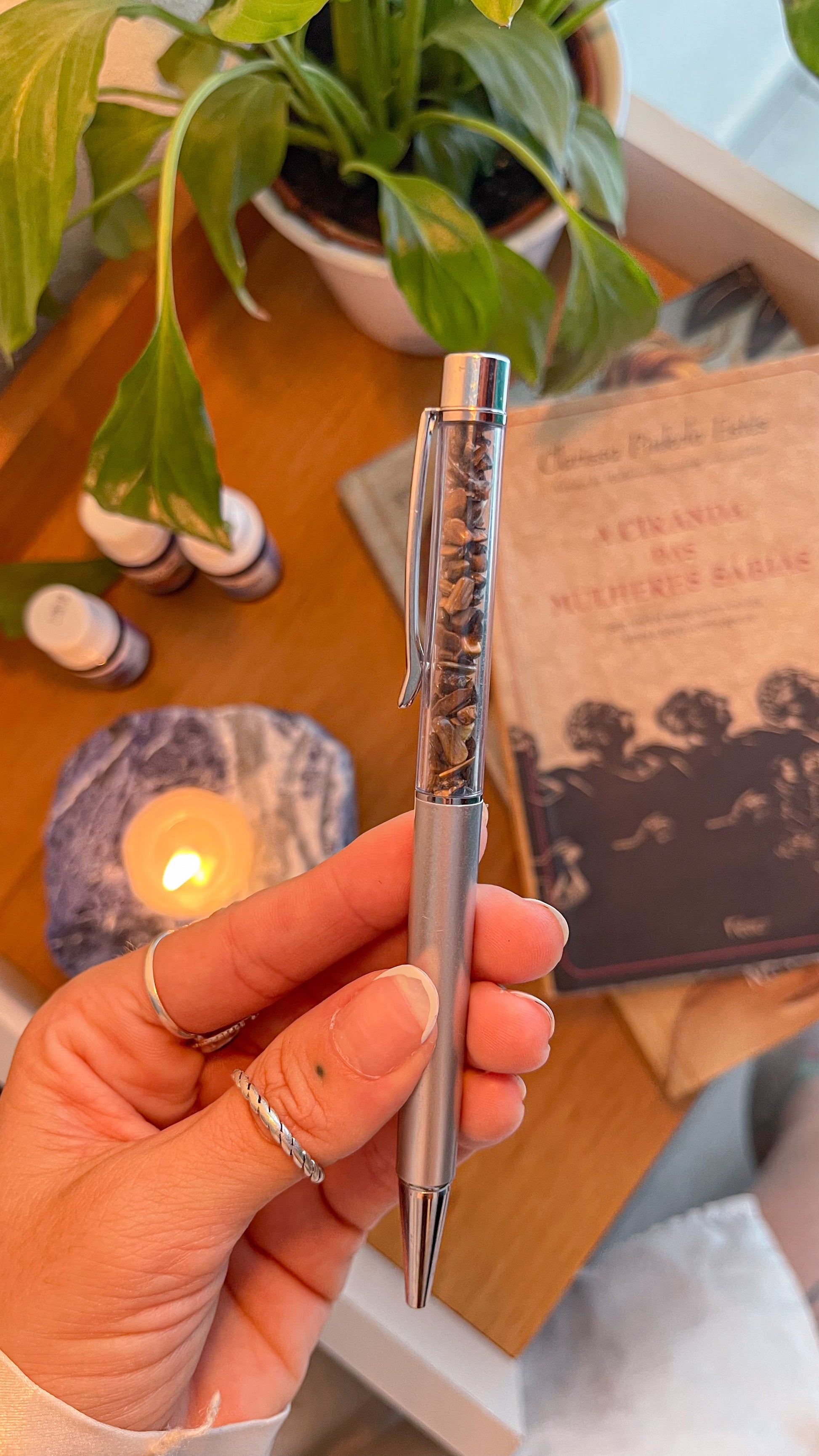 A Caneta com Cristais de Olho de Tigre é um verdadeiro amuleto de coragem e foco. Carregando a energia vibrante desse cristal, ela fortalece sua determinação, equilibra as emoções e ajuda a transformar ideias em ação.