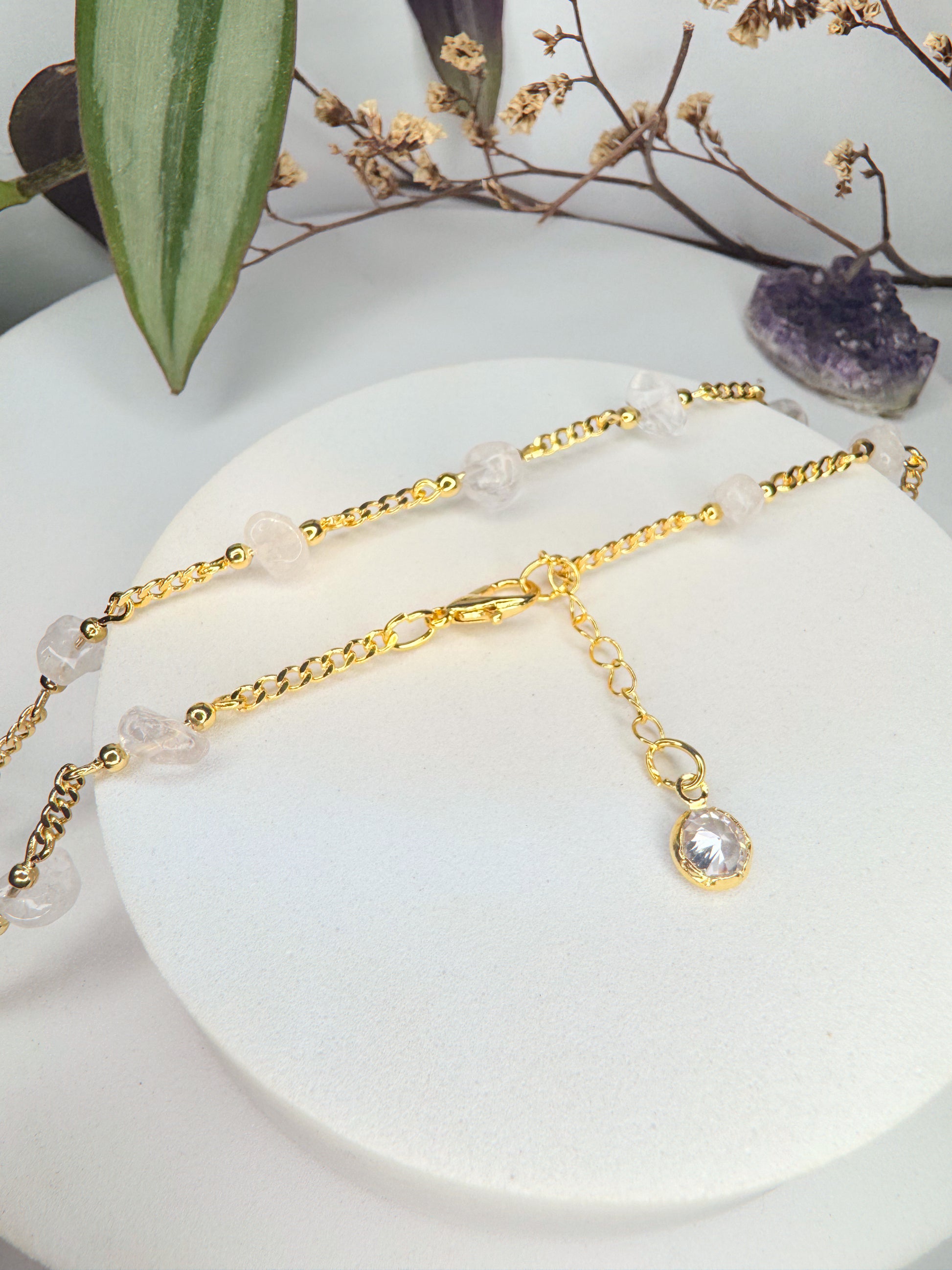 Nesta choker, o Quartzo Transparente aparece de forma delicada e contínua, criando pequenos pontos de luz ao redor do pescoço. Uma peça minimalista, mas cheia de significado, ideal para quem deseja alinhar energia, trazer foco e manter a mente clara no dia a dia.