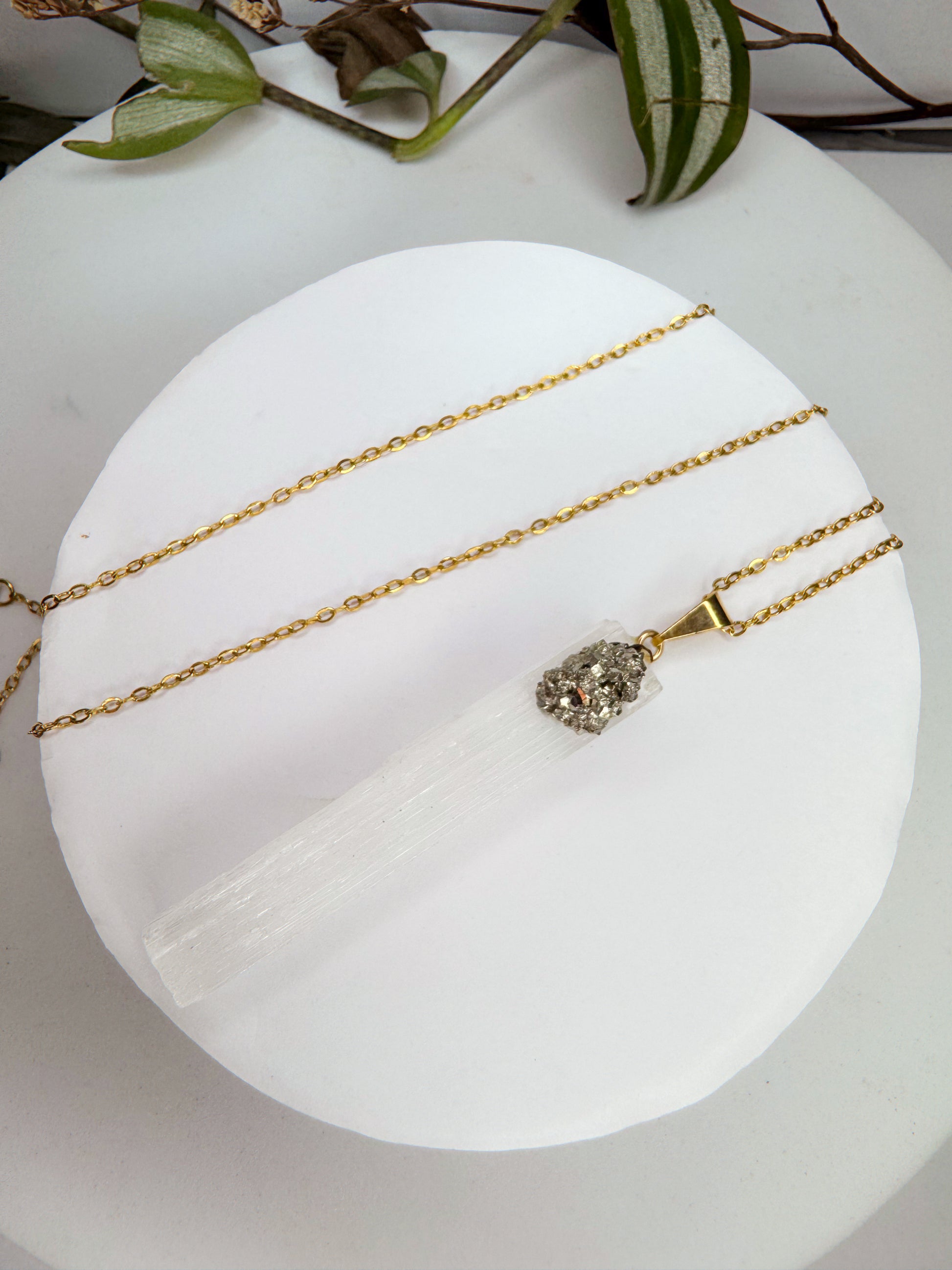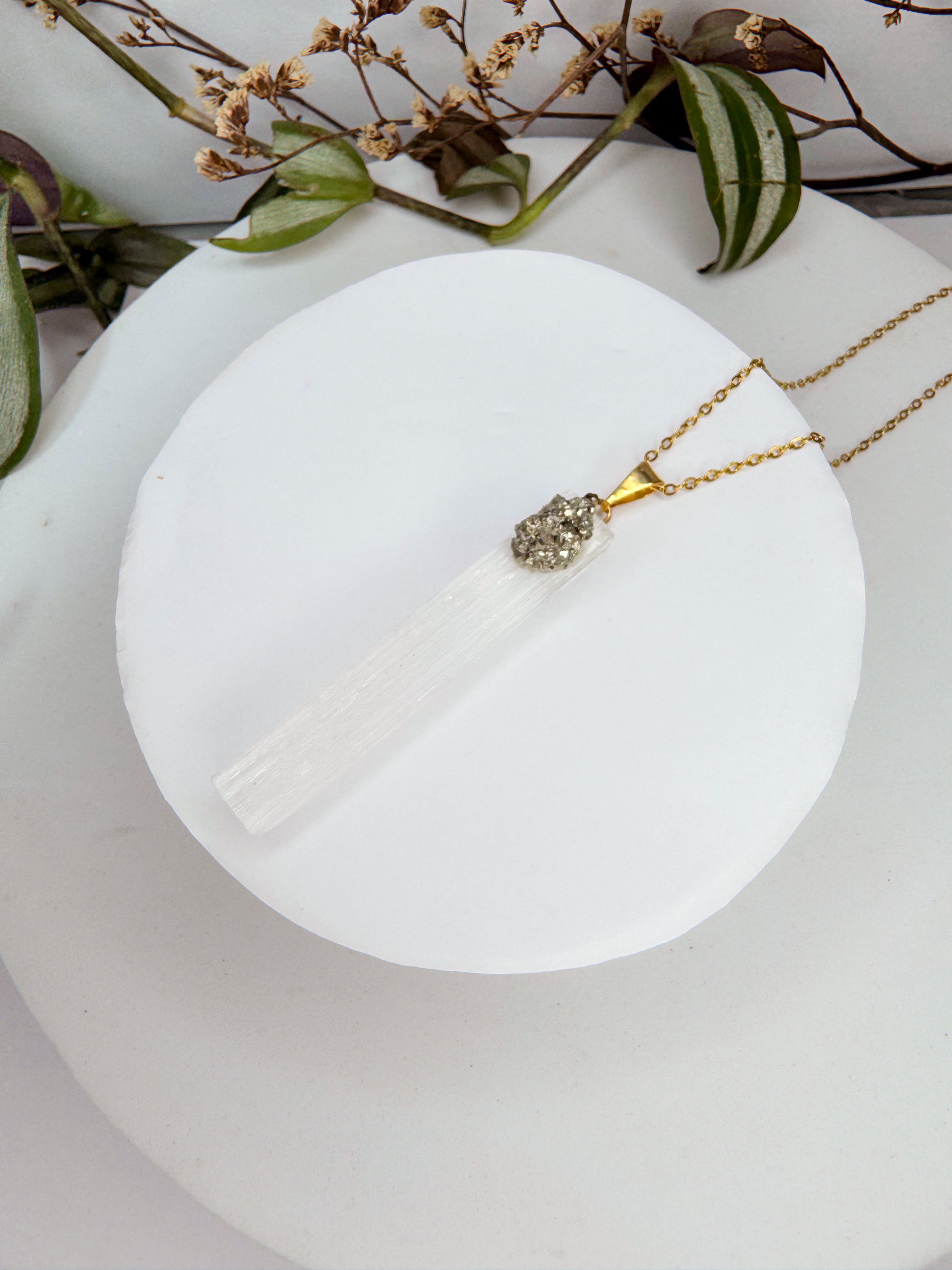 A união da Selenita com a Pirita forma um poderoso amuleto de luz, proteção e abundância.