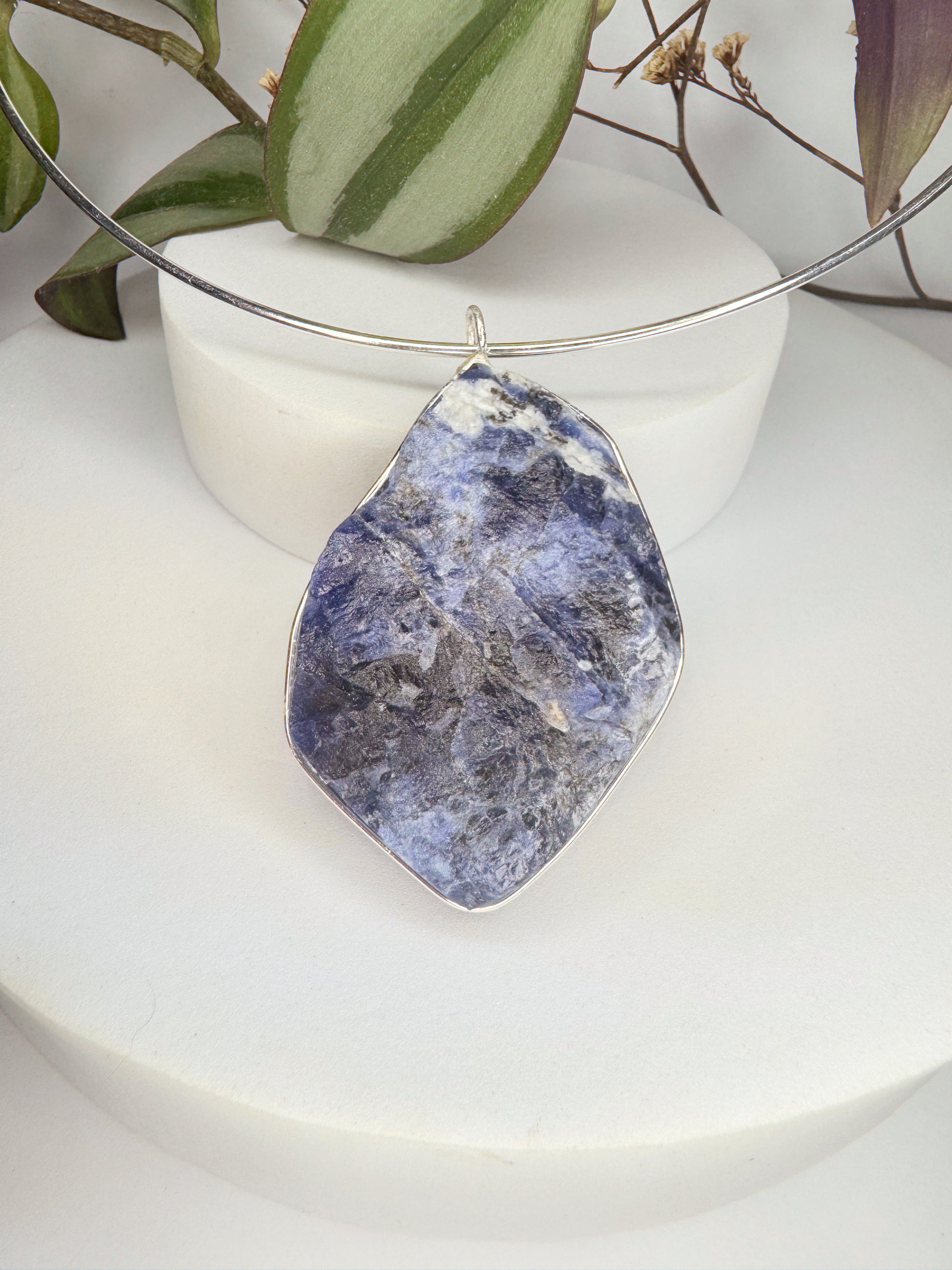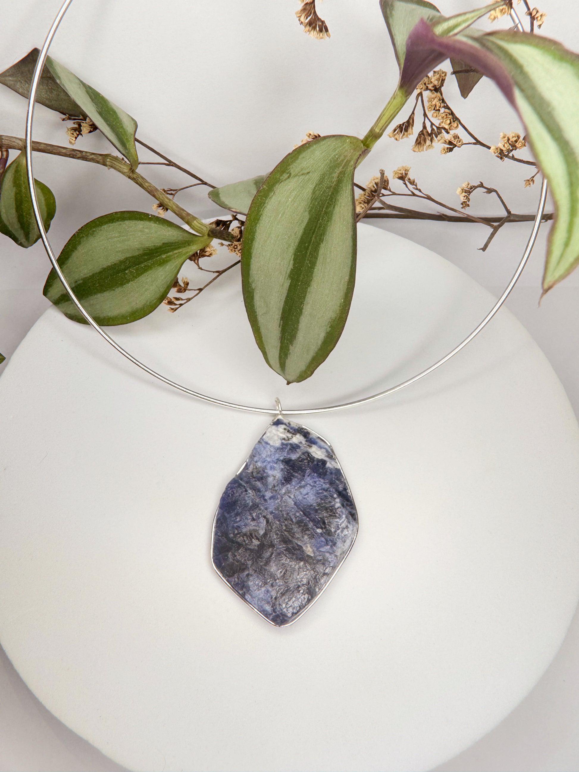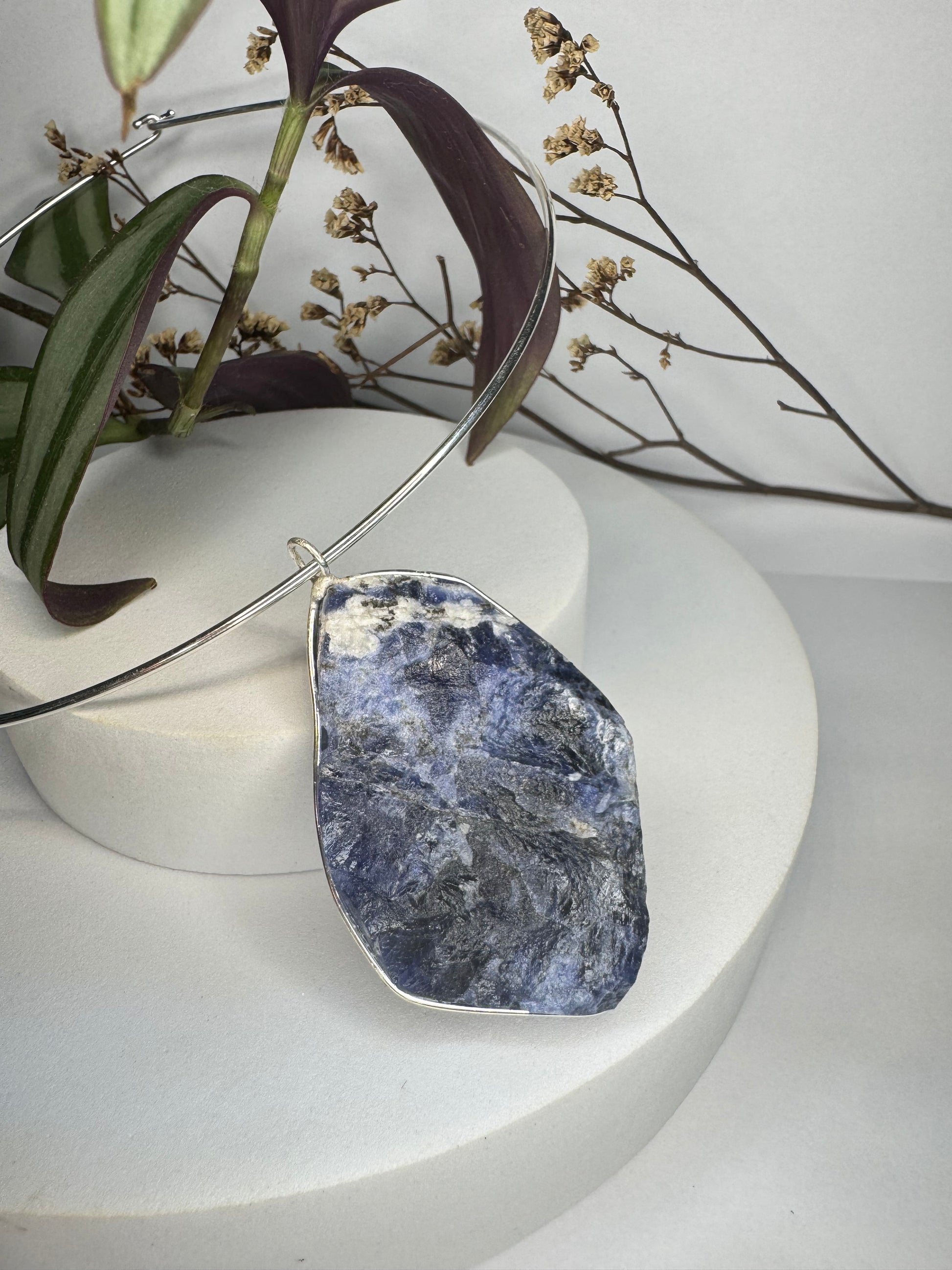 Neste colar, a Sodalita ganha destaque em um aro estruturado que transmite presença e sofisticação.