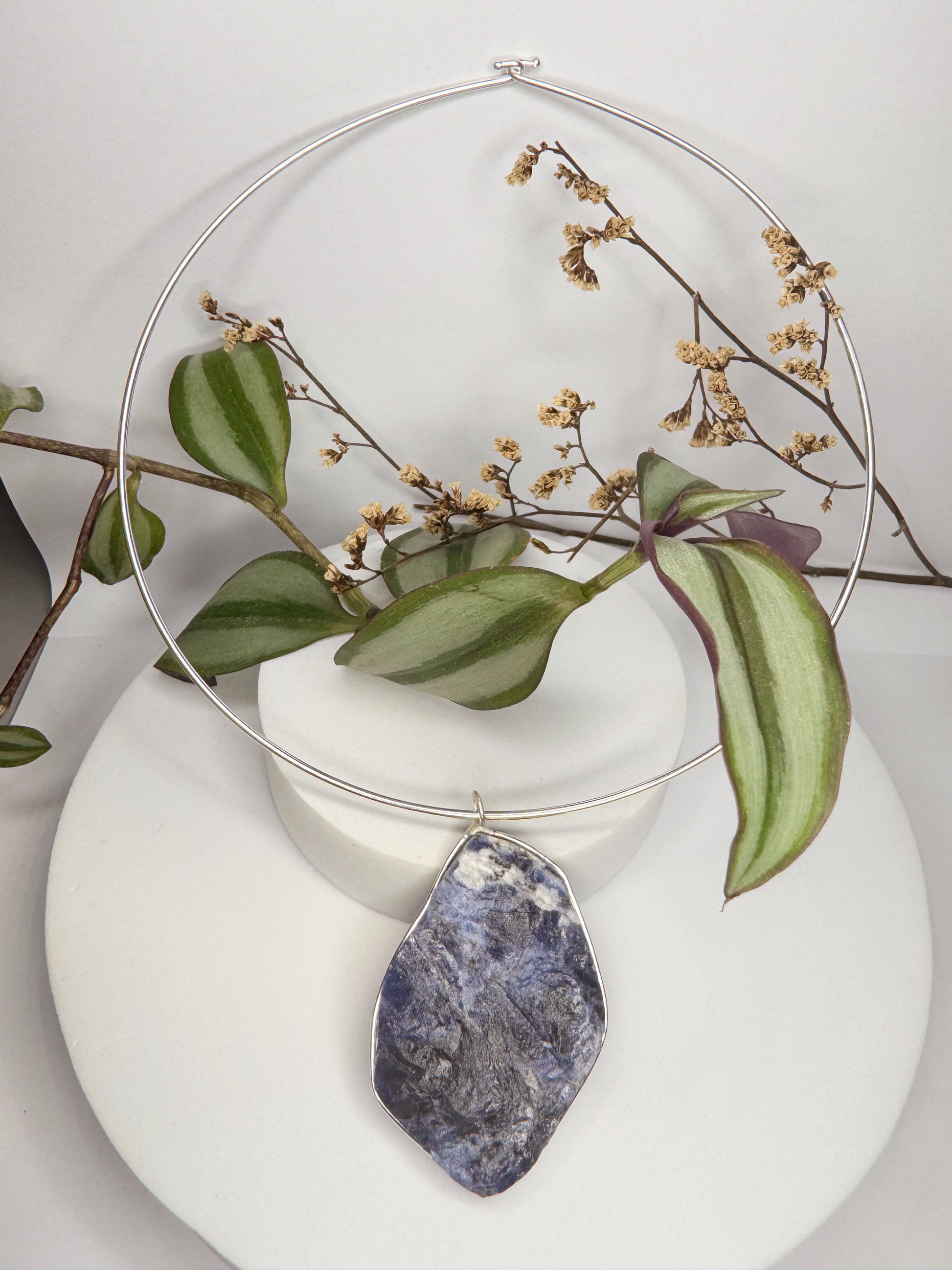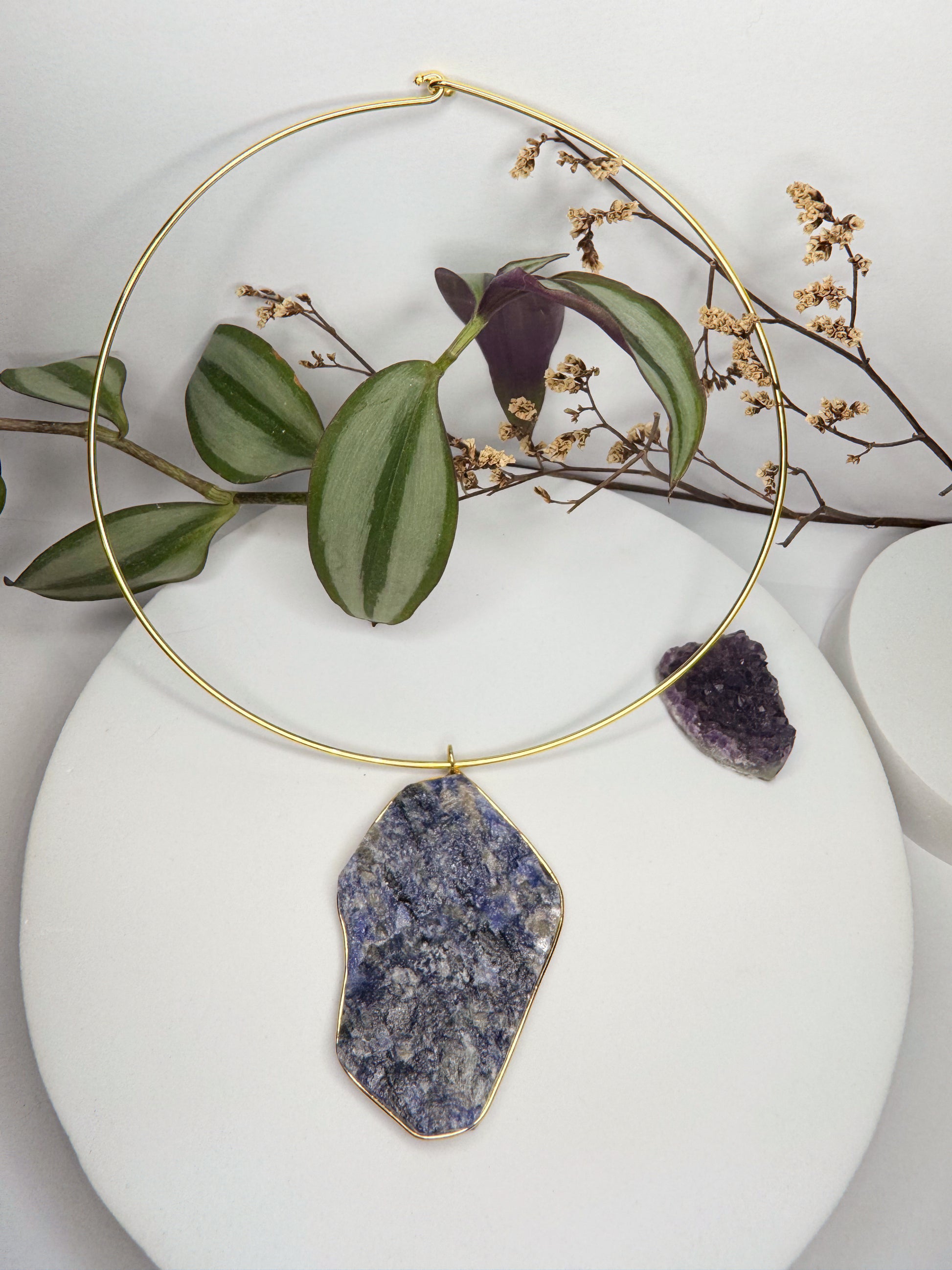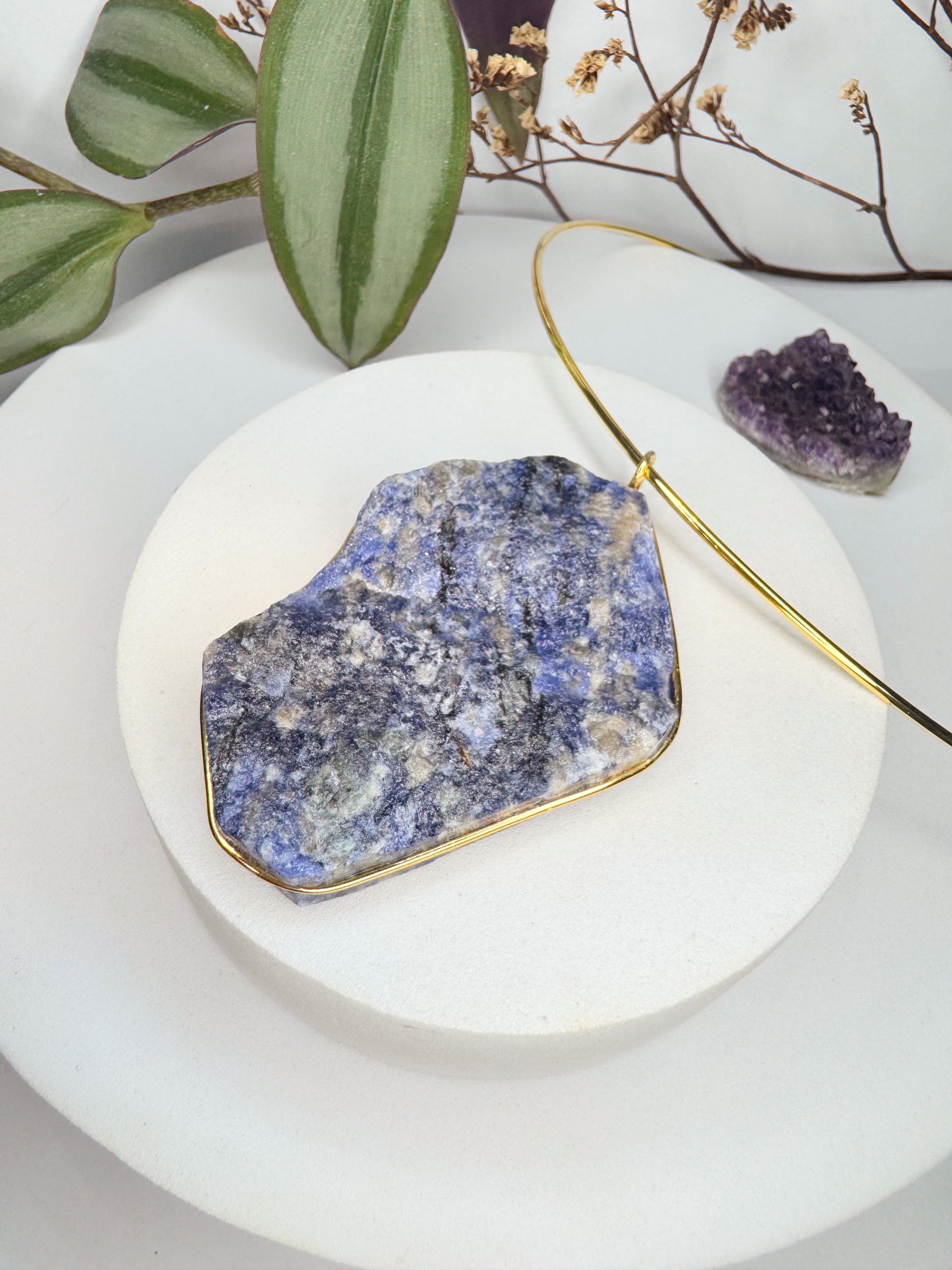 Neste colar, a Sodalita ganha destaque em um aro estruturado que transmite presença e sofisticação.