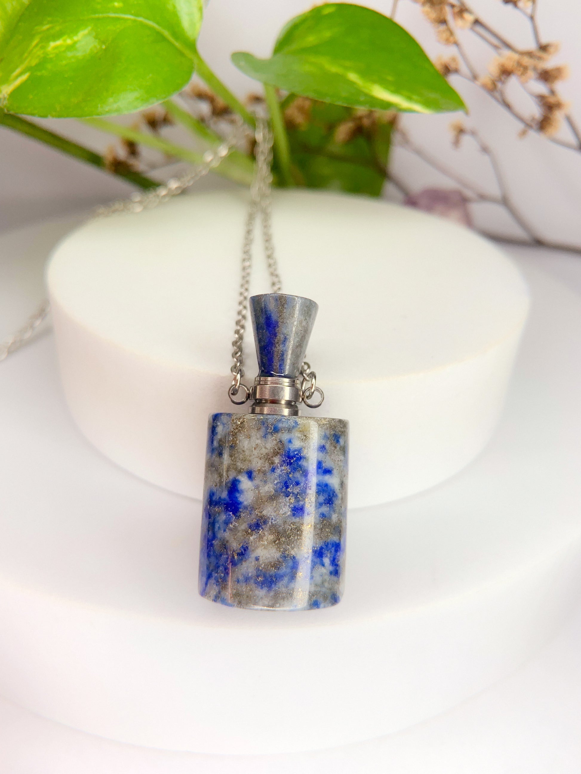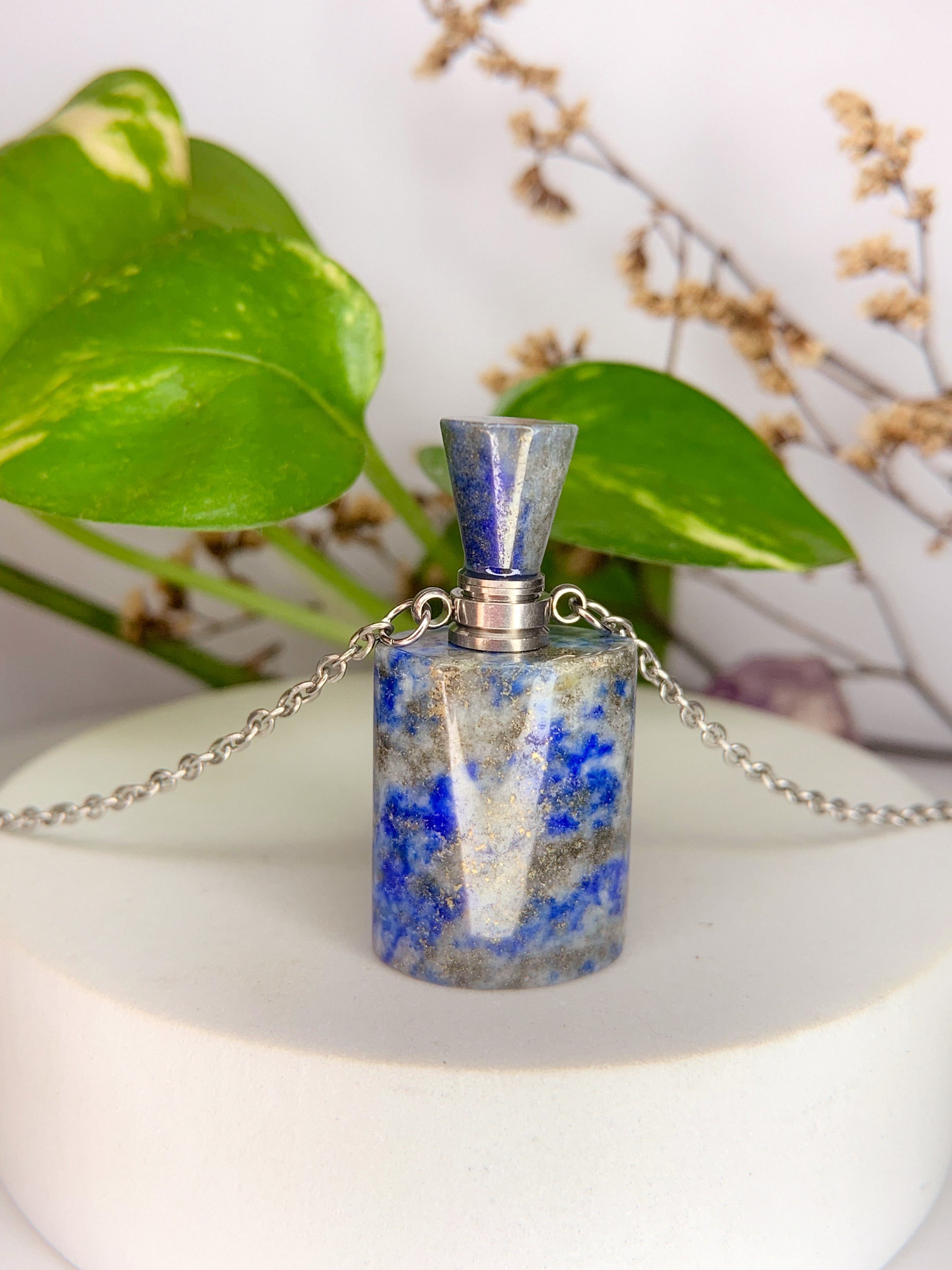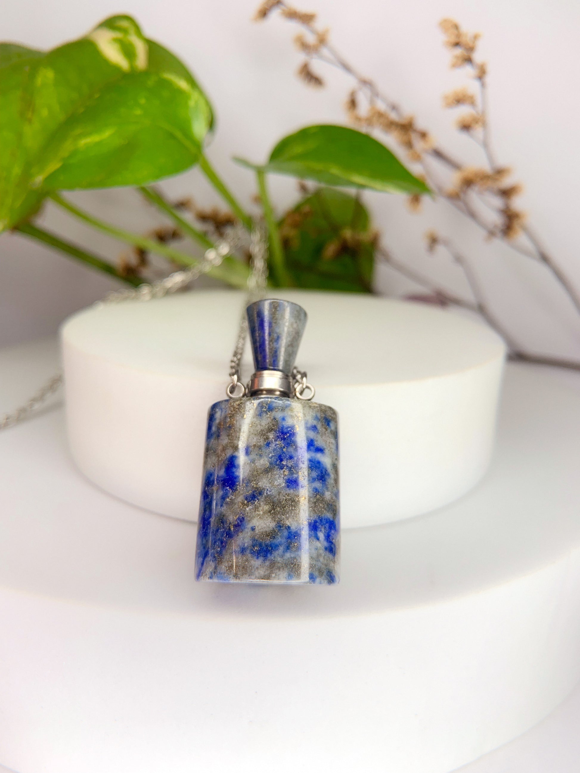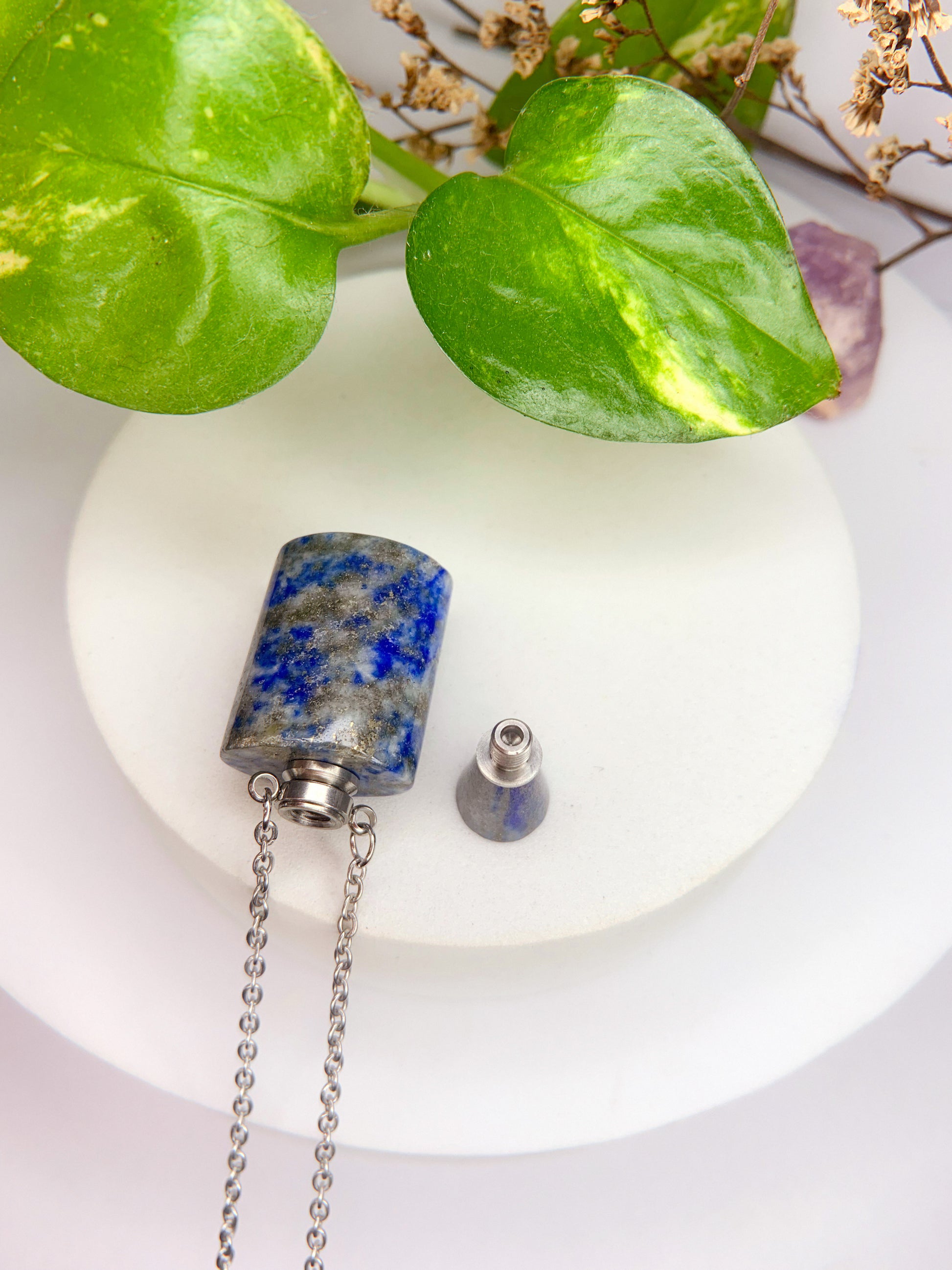 O colar difusor de lápis-lazúli é uma peça sofisticada que combina elegância e benefícios terapêuticos. O lápis-lazúli, conhecido por suas propriedades de promover a sabedoria, a intuição e a verdade, é a pedra central deste colar. Seu design de difusor permite adicionar algumas gotas do seu óleo essencial favorito, difundindo uma fragrância suave e relaxante ao longo do dia. Este colar é perfeito para aqueles que buscam um acessório que não só adorna, mas também enriquece a mente e o espírito, proporcionando um toque de bem-estar e tranquilidade em qualquer ocasião.