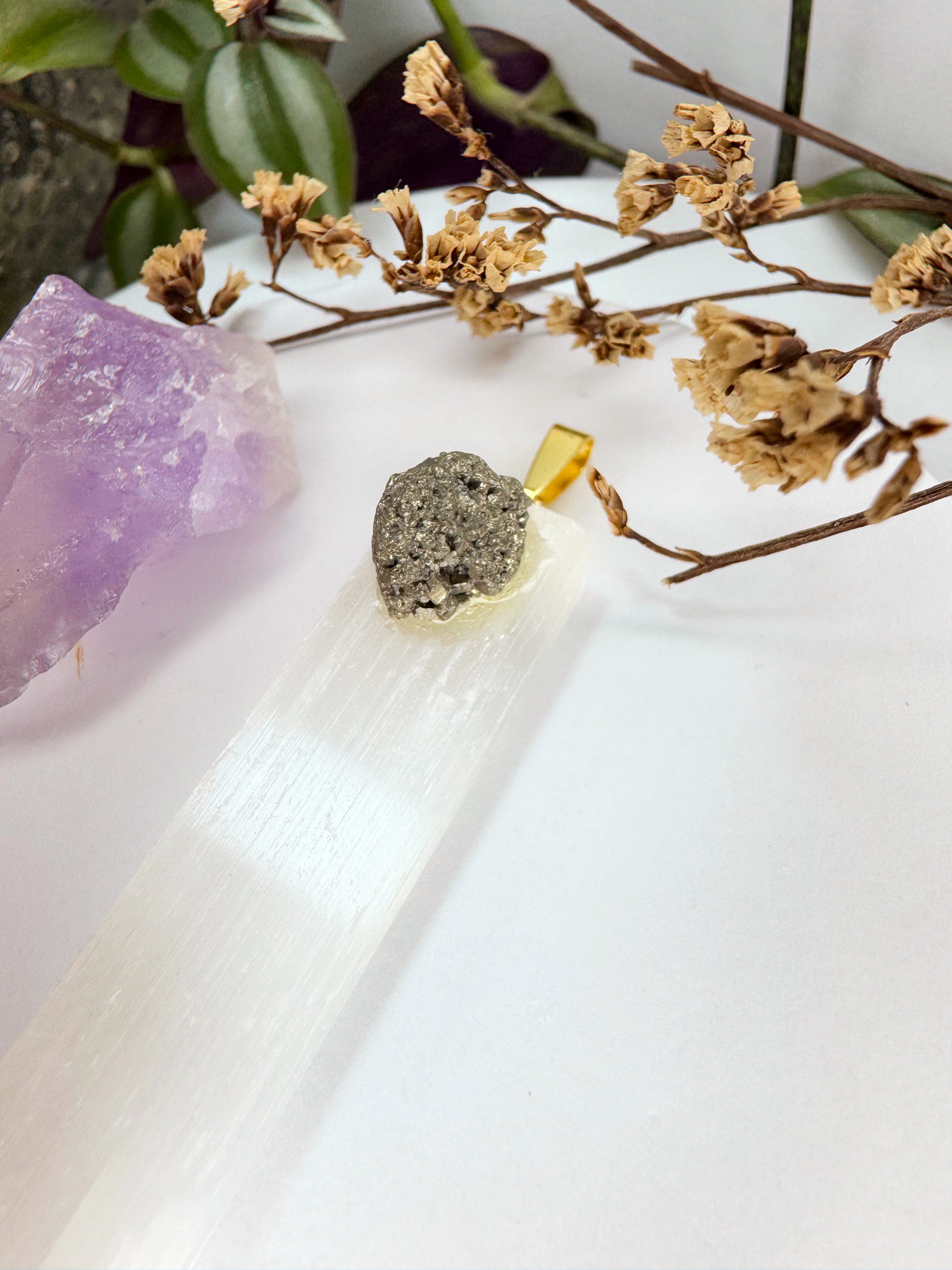 A Selenita é um cristal da clareza e da purificação, capaz de limpar energias negativas e trazer paz interior. Já a Pirita, chamada de a pedra da prosperidade, fortalece a autoconfiança e atrai oportunidades, sendo um símbolo de força e realização.