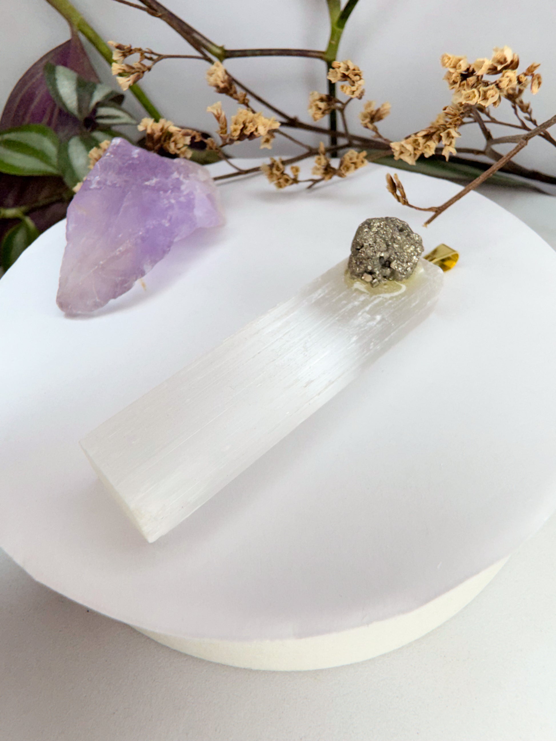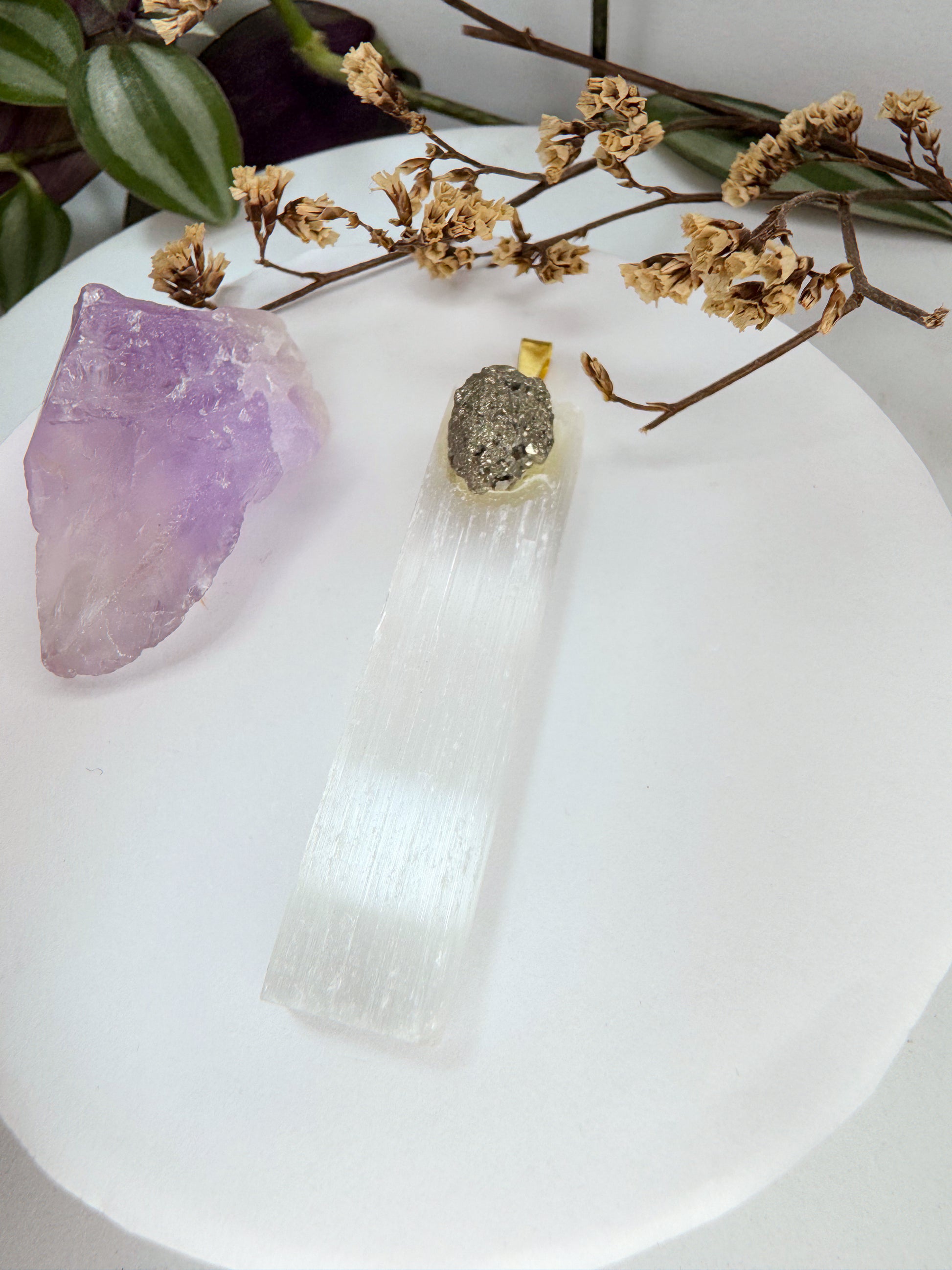 A união da Selenita com a Pirita forma um poderoso amuleto de luz, proteção e abundância.